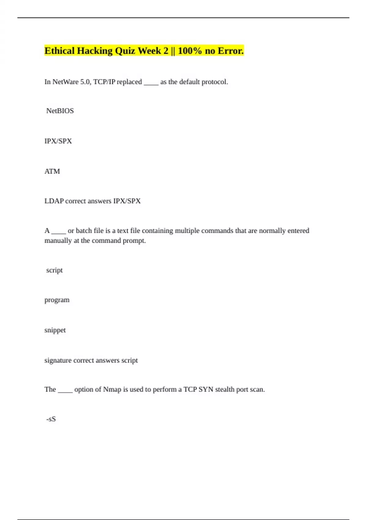 In NetWare 5.0, TCP/IP replaced ____ as the default protocol. NetBIOS IPX/SPX ATM LDAP correct answers IPX/SPX A ____ or batch file is a text file containing multiple commands that are normally entered manually at the command prompt. script program snippet signature correct answers script The ____ option of Nmap is used to perform a TCP SYN stealth port scan. -sS