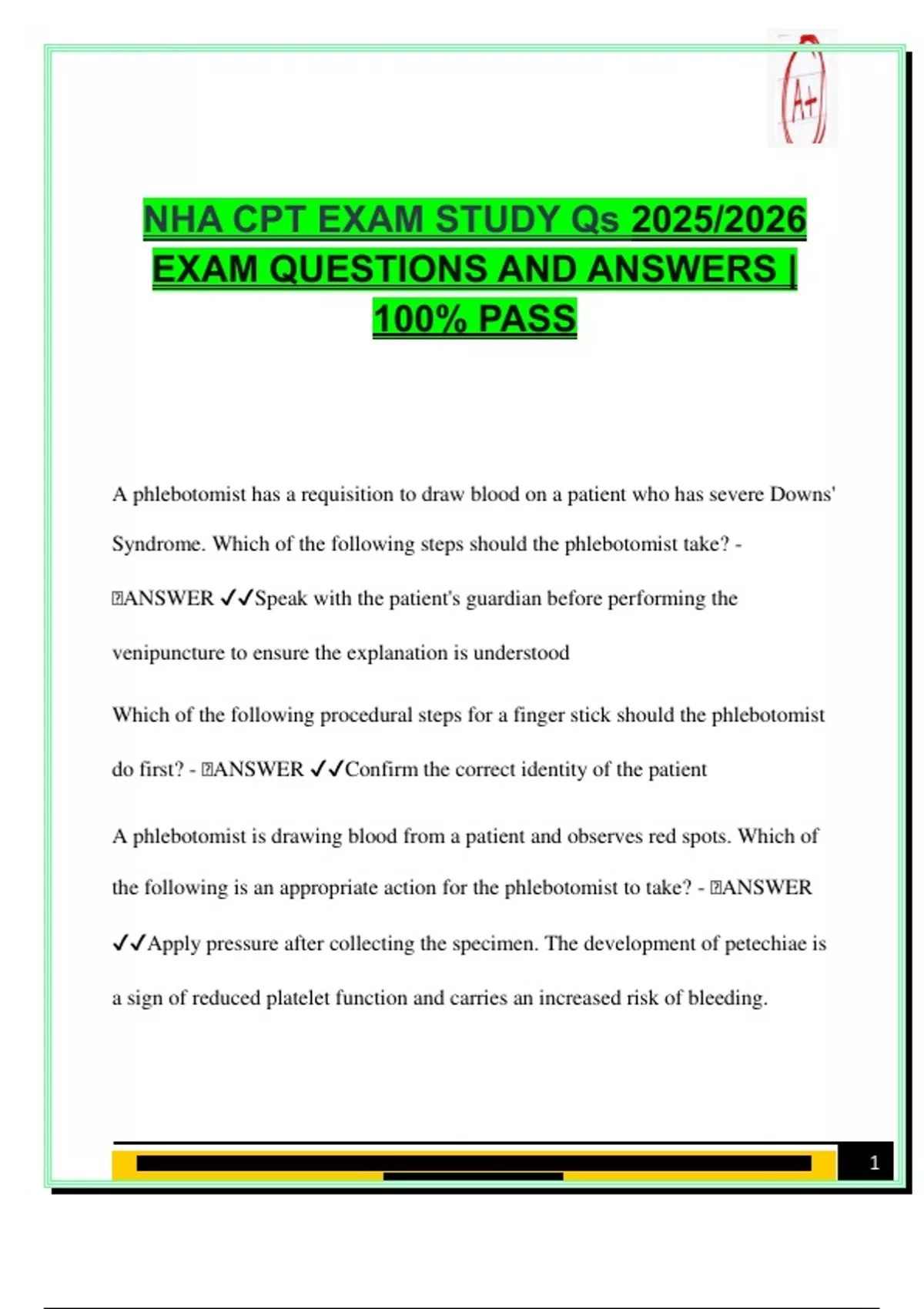 This study set includes 100 solved and updated practice questions for the 2025/2026 NHA Certified Phlebotomy Technician (CPT) exam. Topics covered include venipuncture and dermal puncture techniques, tube order and additives, capillary collection protocols, patient consent (implied and informed), labeling procedures, hemolysis prevention, shock response, OSHA and HIPAA guidelines, and specimen transport. A reliable and realistic review tool for NHA exam success. Keywords: order of draw, venipuncture technique, capillary collection, tube additives, patient identification, informed consent, implied consent, hemostasis, tourniquet timing, hemolysis prevention, anticoagulant tubes, OSHA safety, HIPAA compliance, petechiae, specimen labeling, needle safety, iatrogenic anemia, ammonia specimen, PTT test, point-of-care testing