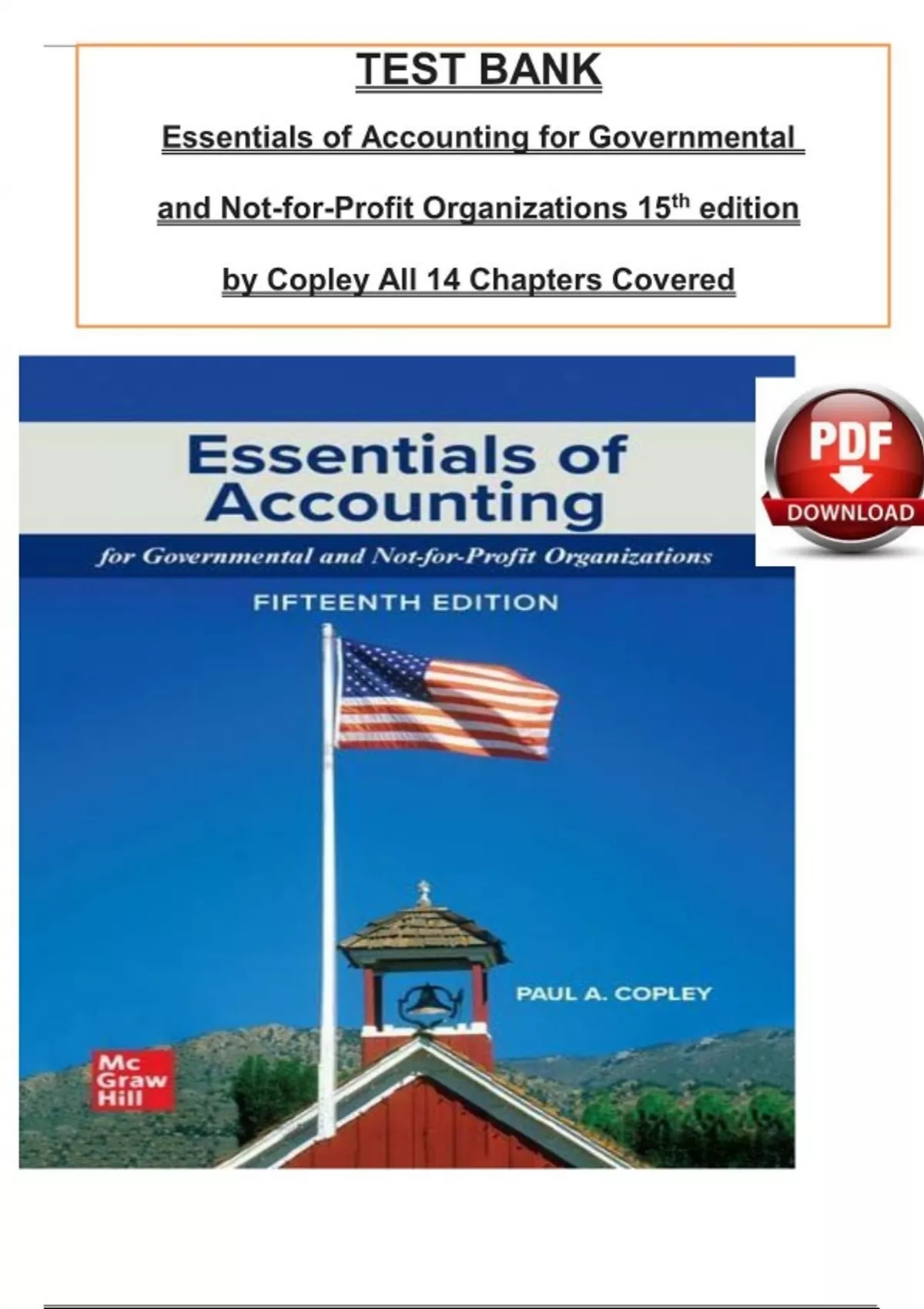 This document is the complete test bank for Essentials of Accounting for Governmental and Not-for-Profit Organizations (15th Edition) by Michael H. Copley. It includes a comprehensive collection of multiple-choice and true/false questions with correct answers for each chapter. The questions cover core topics such as fund accounting, financial reporting, budgetary control, governmental funds, proprietary funds, fiduciary funds, and not-for-profit accounting. Ideal for exam preparation, assignments, or instructor test creation, this resource aligns closely with the textbook structure and content.