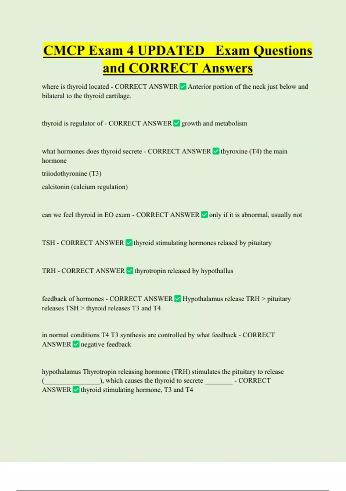 CMCP Exam 4 UPDATED Exam Questions and CORRECT Answers where is thyroid located - CORRECT ANSWER Anterior portion of the neck just below and bilateral to the thyroid cartilage. thyroid is regulator of - CORRECT ANSWER growth and metabolism what hormones does thyroid secrete - CORRECT ANSWER thyroxine (T4) the main hormone triiodothyronine (T3) calcitonin (calcium regulation) can we feel thyroid in EO exam - CORRECT ANSWER only if it is abnormal, usually