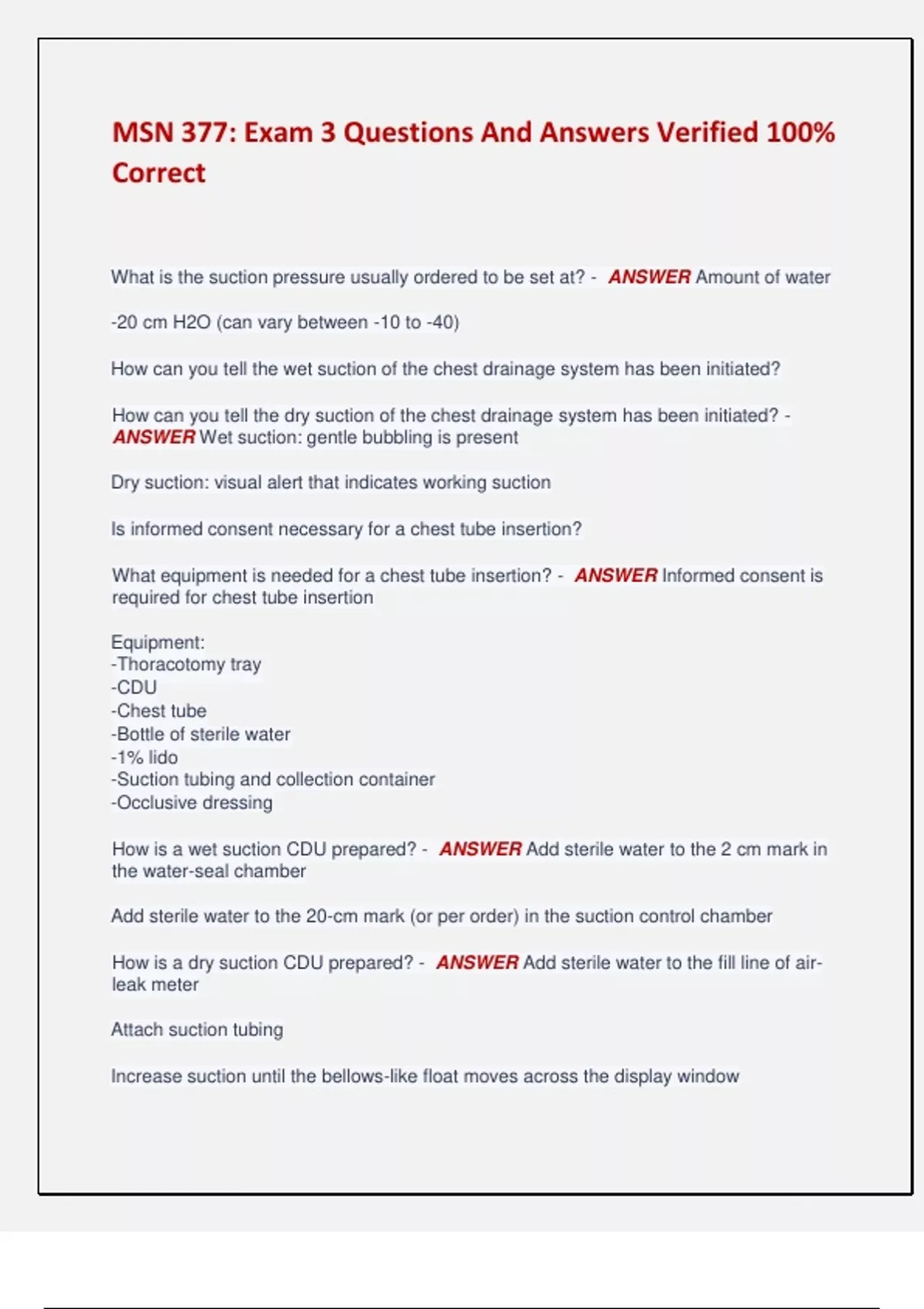 MSN 377: Exam 3 Questions And Answers Verified 100% Correct What is the suction pressure usually ordered to be set at? - ANSWER Amount of water -20 cm H2O (can vary between -10 to -40) How can you tell the wet suction of the chest drainage system has been initiated? How can you tell the dry suction of the chest drainage system has been initiated? - ANSWER Wet suction: gentle bubbling is present Dry suction: visual alert that indicates working suction Is informed consent necessary for a chest tube insertion? What equipment is needed for a chest tube insertion? - ANSWER Informed consent is required for chest tube insertion Equipment: -Thoracotomy tray -CDU -Chest tube -Bottle of sterile water -1% lido -Suction tubing and collection container -Occlusive dressing How is a wet suction CDU prepared? - ANSWER Add sterile water to the 2 cm mark in the water-seal chamber Add sterile water to the 20-cm mark (or per order) in the suction control chamber How is a dry suction CDU prepared? - ANSWER Add sterile water to the fill line of air- leak meter Attach suction tubing Increase suction until the bellows-like float moves across the display window How should a patient be positioned when undergoing chest tube insertion? - ANSWER Arm on affected side raised above the head to expose the mid-axillary area HOB 30 - 60 degrees What kind of gauze is used over the chest tube insertion site? - ANSWER Occlusive, petroleum gauze dressing What can occur if the chest tube is clamped? - ANSWER Increase risk for tension pneumothorax In what position should the CDU be in at all times? - ANSWER Dependent position What potential complications can occur in a patient with a CDU? - ANSWER Rapid removal of pleural fluid: > 1000 ml - notify provider Subcutaneous emphysema: introduction of air into the subcutaneous tissues; feels like bubble wrap Bleeding Atelectasis Infection Accidental disconnection When is a chest tube removed? What should be done prior to its removal? What should be done following removal? - ANSWER When the lung is re-expanded or the fluid drainage is minimal/has ceased Prior to removal: -24 hours: chest tube to gravity/without suctioning --Making sure the lung remains inflated -30 - 60 minutes prior to removal: pre-medicate with pain meds -Pt should be instructed to hold breath while tube is pulled out After removal: -Occlusive petroleum bandage applied while tube is removed F/u CXR When might a thoracotomy be performed? What is the most common approach for a thoracotomy? - ANSWER Tumor Infection Trauma Posterolateral approach What surgical approach might be used instead of a thoracotomy due to reduced post-op pain, decreased length of stay, decreased morbidity, and few complications? - ANSWER Video-Assisted Thoracoscopic Surgery (VATS) What should be done (work up/education) prior to a thoracotomy or video-assisted thoracoscopic surgery? - ANSWER PFTs, ABGs: confirm respiratory stability Cardiac work up: determine if any heart involvement that should be addressed during the surgery Educate: -Smoking cessation for at least a month before the surgery to improve oxygenation Post-op expectations: oxygen, intubation, chest tubes What should be included in the post-op respiratory assessment for a patient following thoracic surgery? - ANSWER Respiratory rate, effort Sputum eval Lung sounds Chest tube drainage What is the respiratory condition where fluid accumulates in the pleural space, exerting pressure on the lung and decreasing gas exchange? What is this condition indicative of? - ANSWER Pleural effusion: fluid collection between the parietal and visceral pleura Indicative of disease What is the difference between transudate, exudate, and empyema when it comes to pleural effusion? - ANSWER Transudate: caused by an abnormality in the patient's fluid regulation system Exudate: inflammatory reaction to an external cause, resulting in edema