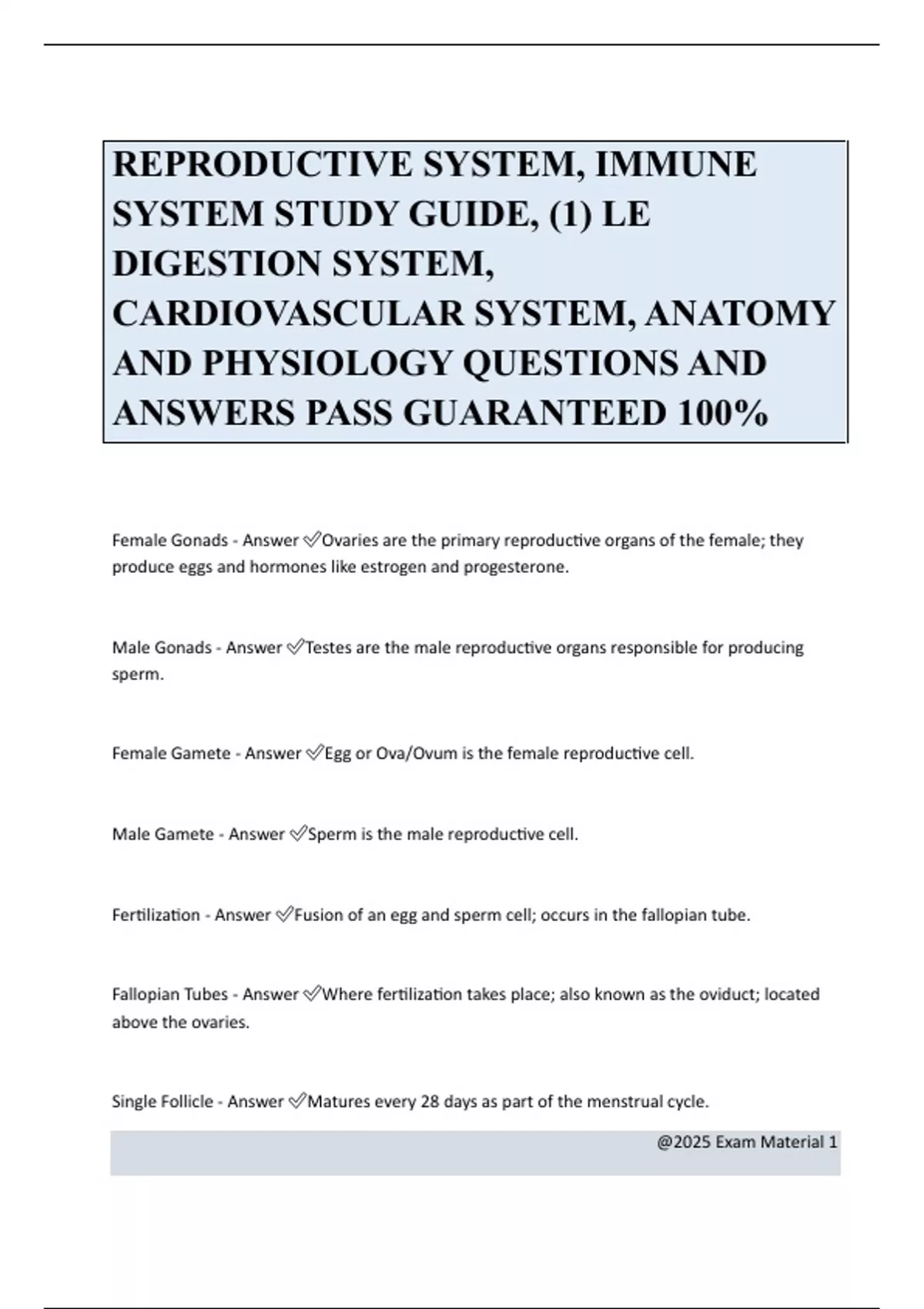REPRODUCTIVE SYSTEM, IMMUNE SYSTEM STUDY GUIDE, (1) LE DIGESTION SYSTEM, CARDIOVASCULAR SYSTEM, ANATOMY AND PHYSIOLOGY QUESTIONS AND ANSWERS PASS GUARANTEED 100% Female Gonads - Answer Ovaries are the primary reproductive organs of the female; they produce eggs and hormones like estrogen and progesterone. Male Gonads - Answer Testes are the male reproductive organs responsible for producing sperm. Female Gamete - Answer Egg or Ova/Ovum is the female reproductive cell. Male Gamete - Answer Sperm is the male reproductive cell. Fertilization - Answer Fusion of an egg and sperm cell; occurs in the fallopian tube. Fallopian Tubes - Answer Where fertilization takes place; also known as the oviduct; located above the ovaries. Single Follicle - Answer Matures every 28 days as part of the menstrual cycle. @2025 Exam Material 2 Puberty - Answer Developmental stage when a person becomes capable of reproduction. Menarche - Answer The first menstrual period that marks the onset of reproductive ca