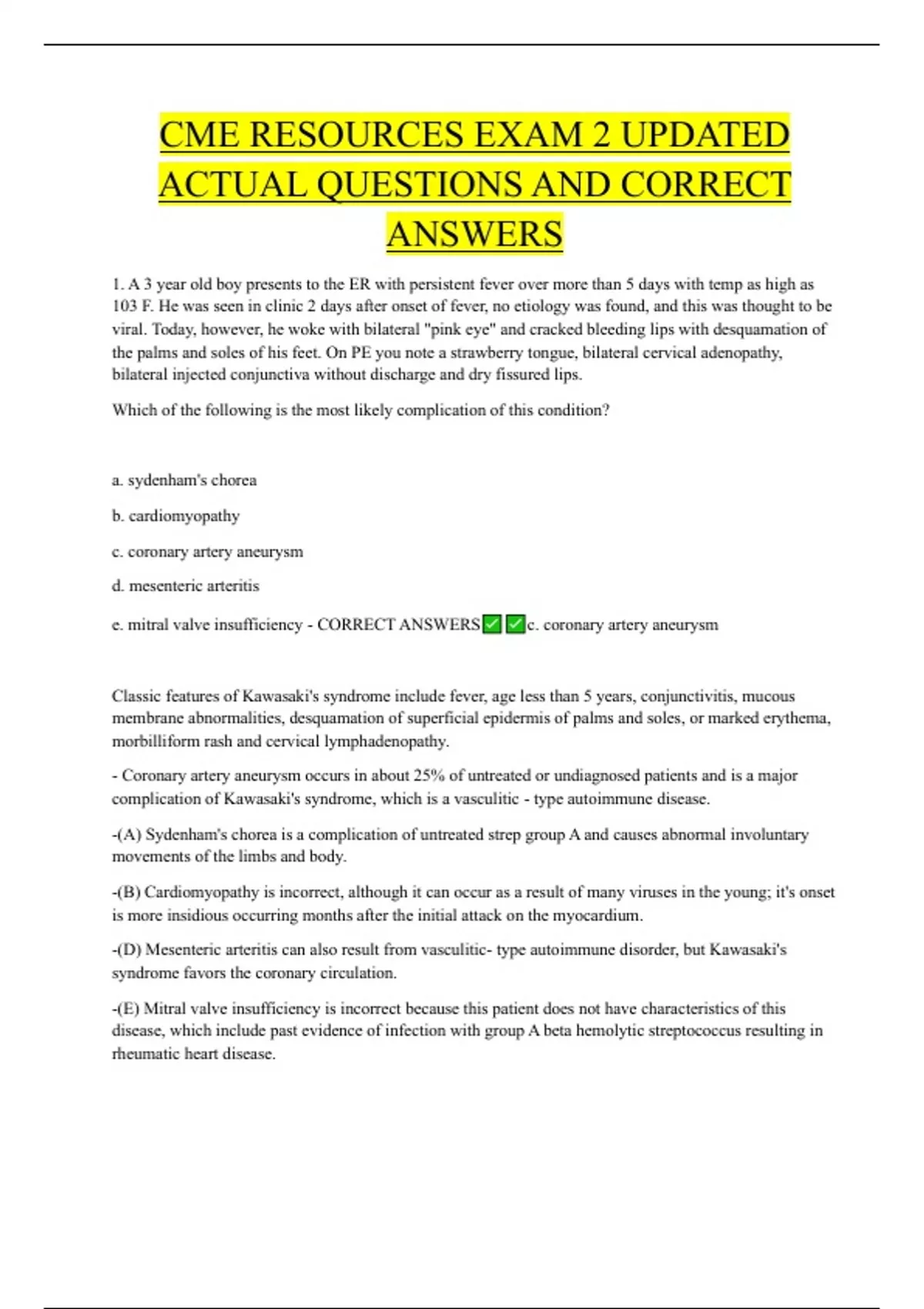 CME RESOURCES EXAM 2 UPDATED ACTUAL QUESTIONS AND CORRECT ANSWERS 1. A 3 year old boy presents to the ER with persistent fever over more than 5 days with temp as high as 103 F. He was seen in clinic 2 days after onset of fever, no etiology was found, and this was thought to be viral. Today, however, he woke with bilateral "pink eye" and cracked bleeding lips with desquamation of the palms and soles of his feet. On PE you note a strawberry tongue, bilateral cervical adenopathy, bilateral injected conjunctiva without discharge and dry fissured lips. Which of the following is the most likely complication of this condition? a. sydenham's chorea b. cardiomyopathy c. coronary artery aneurysm d. mesenteric arteritis e. mitral valve insufficiency - CORRECT ANSWERS c. coronary artery aneurysm