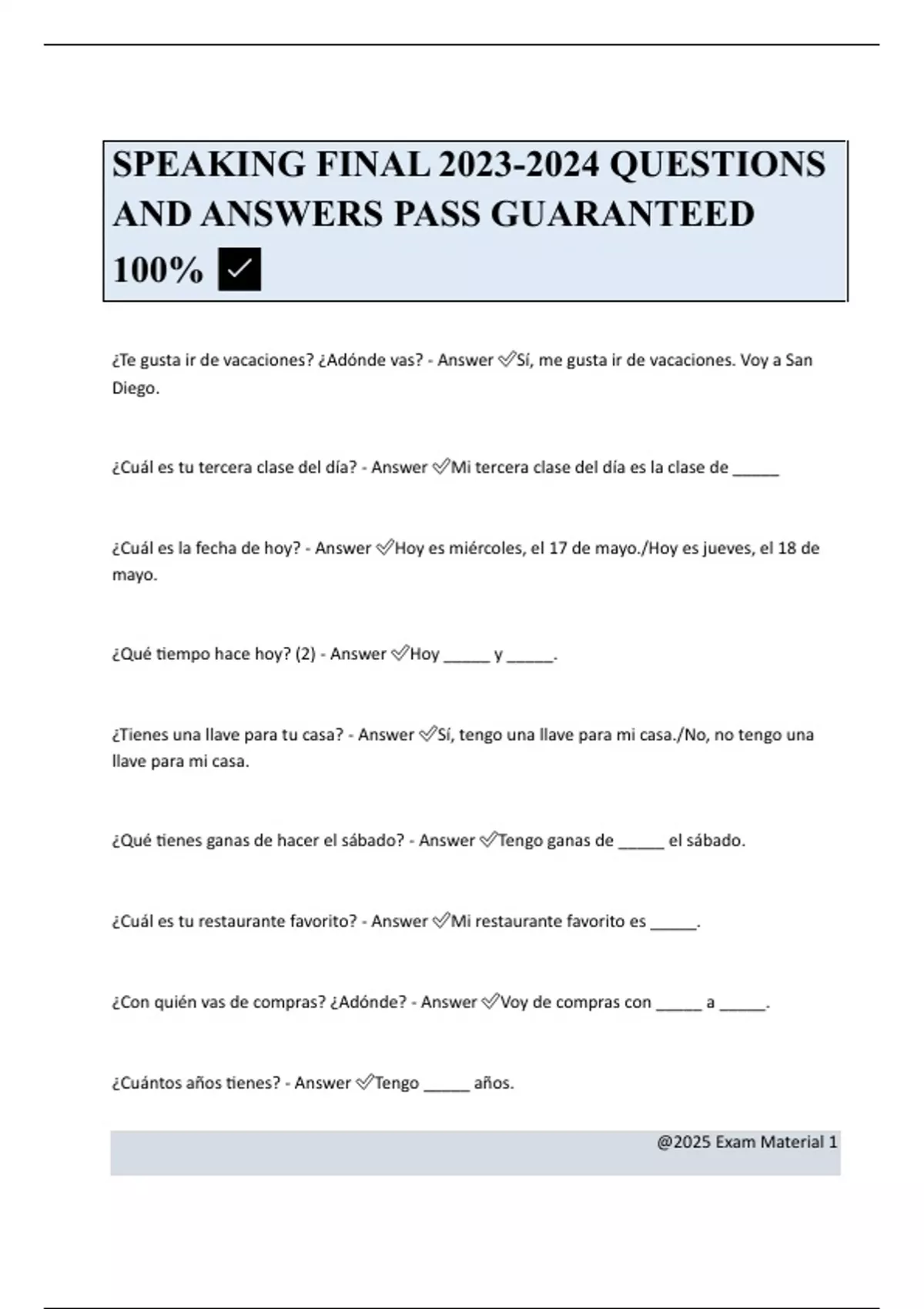 @2025 Exam Material 1 SPEAKING FINAL QUESTIONS AND ANSWERS PASS GUARANTEED 100% ¿Te gusta ir de vacaciones? ¿Adónde vas? - Answer Sí, me gusta ir de vacaciones. Voy a San Diego. ¿Cuál es tu tercera clase del día? - Answer Mi tercera clase del día es la clase de _____ ¿Cuál es la fecha de hoy? - Answer Hoy es miércoles, el 17 de mayo./Hoy es jueves, el 18 de mayo. ¿Qué tiempo hace hoy? (2) - Answer Hoy _____ y _____. ¿Tienes una llave para tu casa? - Answer Sí, tengo una llave para mi casa./No, no tengo una llave para mi casa. ¿Qué tienes ganas de hacer el sábado? - Answer Tengo ganas de _____ el sábado. ¿Cuál es tu restaurante favorito? - Answer Mi restaurante favorito es _____. ¿Con quién vas de compras? ¿Adónde? - Answer Voy de compras con _____ a _____. ¿Cuántos años tienes? - Answer Tengo _____ años.