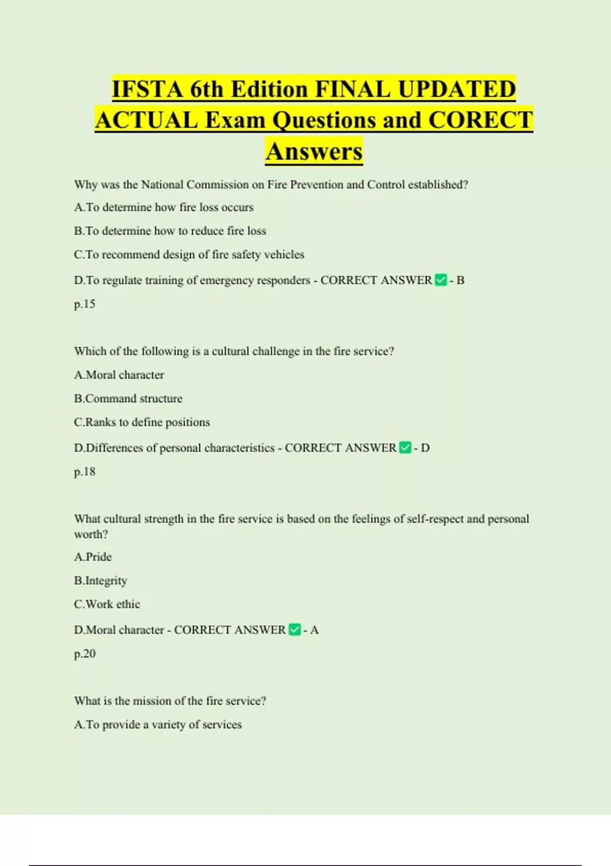 IFSTA 6th Edition FINAL UPDATED ACTUAL Exam Questions and CORECT Answers Why was the National Commission on Fire Prevention and Control established? A.To determine how fire loss occurs B.To determine how to reduce fire loss C.To recommend design of fire safety vehicles D.To regulate training of emergency responders - CORRECT ANSWER - B p.15 Which of the following is a cultural challenge in the fire service?