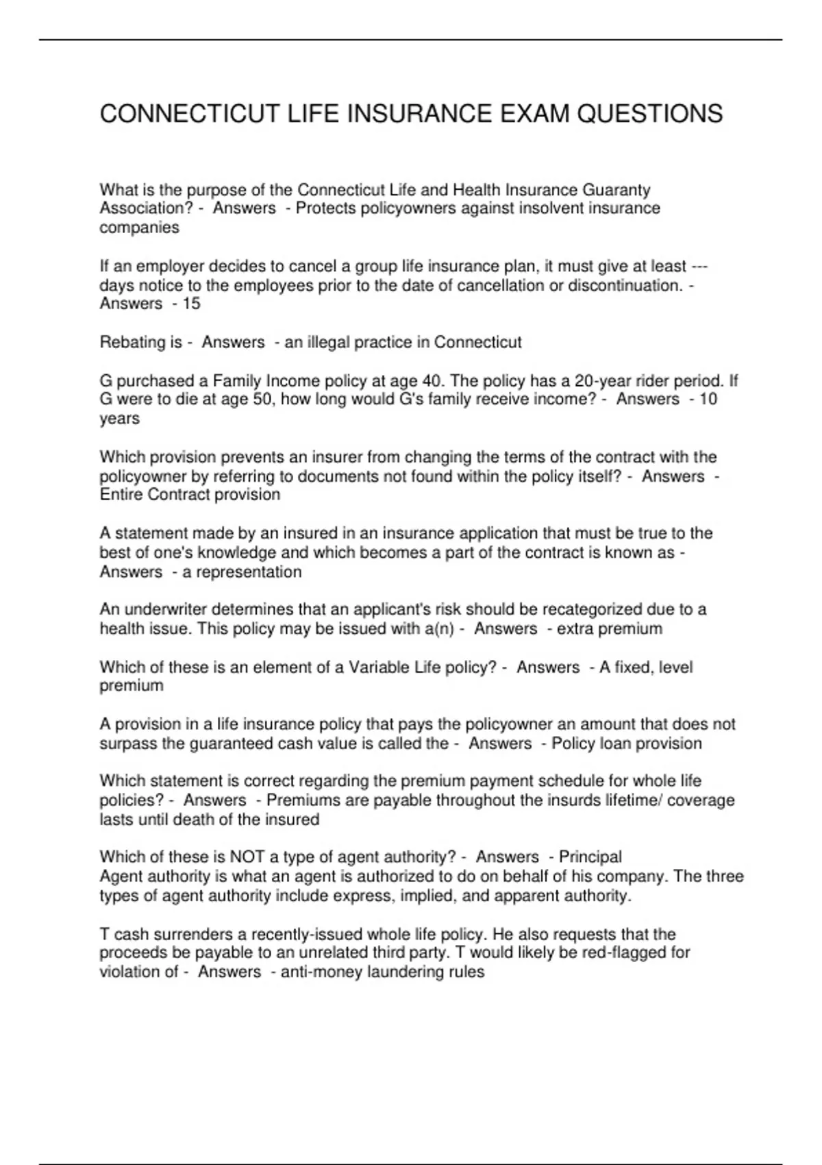 CONNECTICUT LIFE INSURANCE EXAM QUESTIONS