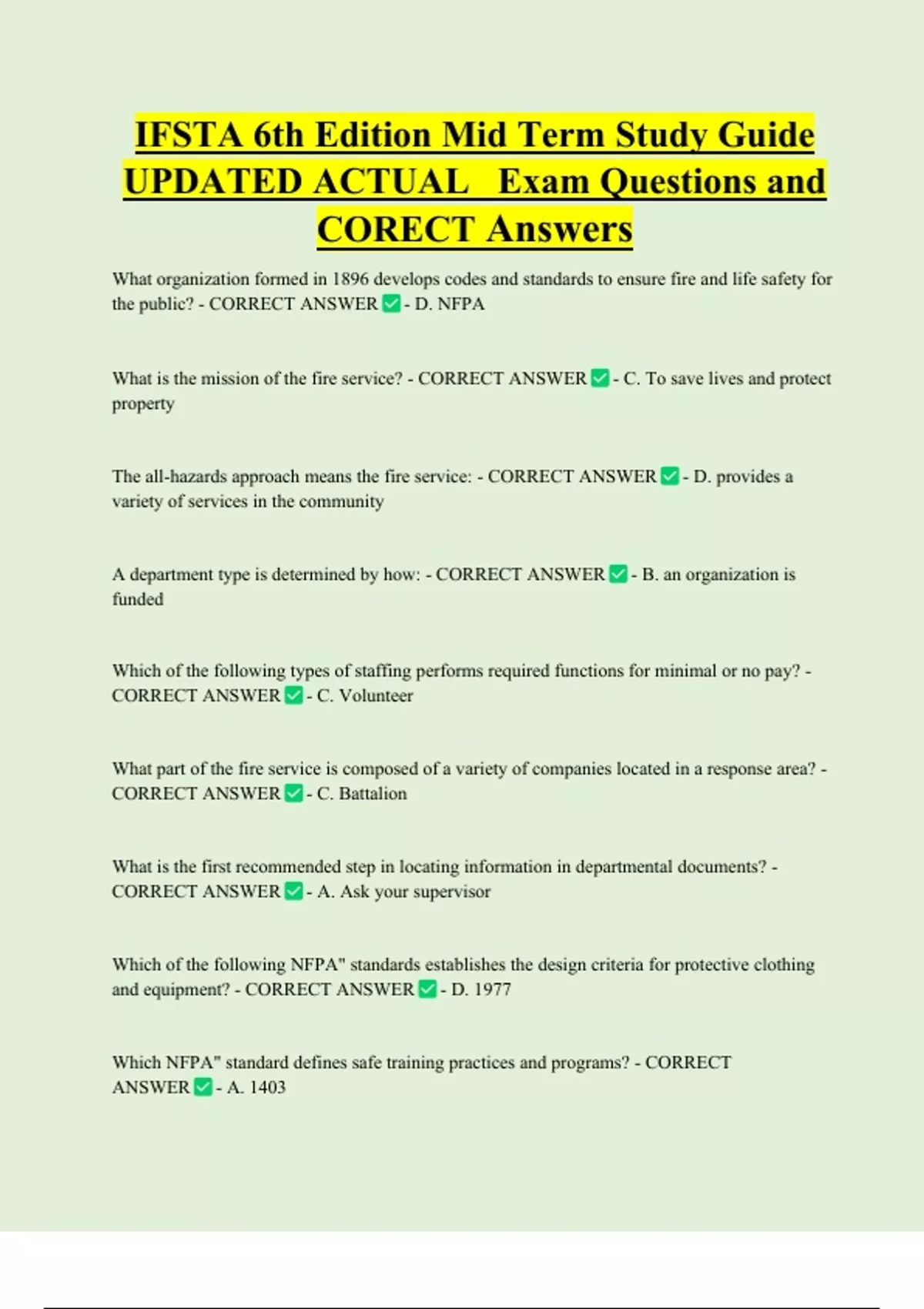 IFSTA 6th Edition Mid Term Study Guide UPDATED ACTUAL Exam Questions and CORECT Answers What organization formed in 1896 develops codes and standards to ensure fire and life safety for the public? - CORRECT ANSWER - D. NFPA What is the mission of the fire service? - CORRECT ANSWER - C. To save lives and protect property The all-hazards approach means the fire service: - CORRECT ANSWER - D. provides a variety of services in the community A department type is determined by how: - CORRECT ANSWER - B. an organizatio