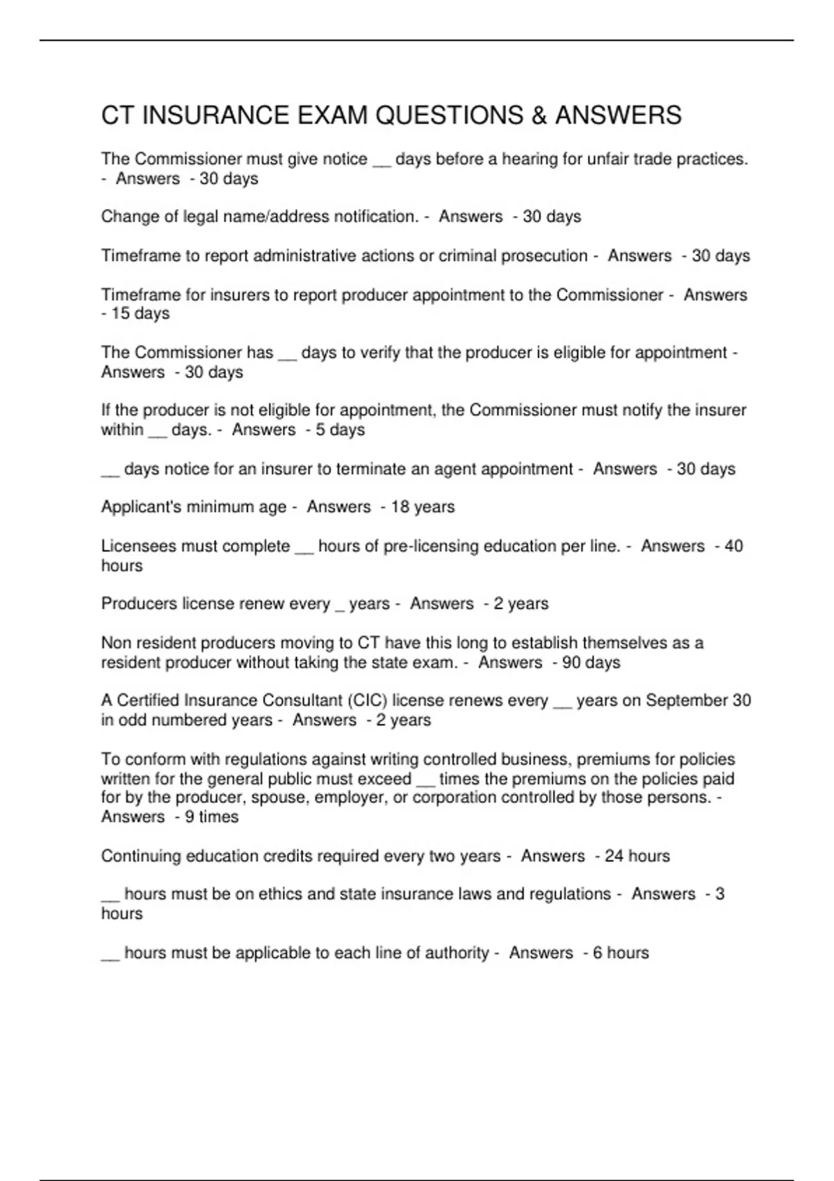 CT INSURANCE EXAM QUESTIONS & ANSWERS