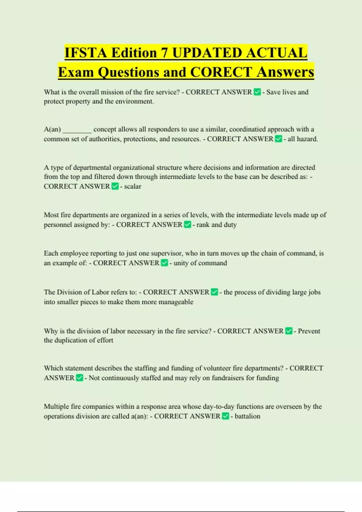 IFSTA Edition 7 UPDATED ACTUAL Exam Questions and CORECT Answers What is the overall mission of the fire service? - CORRECT ANSWER protect property and the environment. - Save lives and A(an) ________ concept allows all responders to use a similar, coordinatied approach with a common set of authorities, protections, and resources. - CORRECT ANSWER - all hazard. A type of departmental organizational structure where decisions and information are directed from the top and filtered down through intermediate levels to the base can be described as: - CORRECT ANSWER - scala