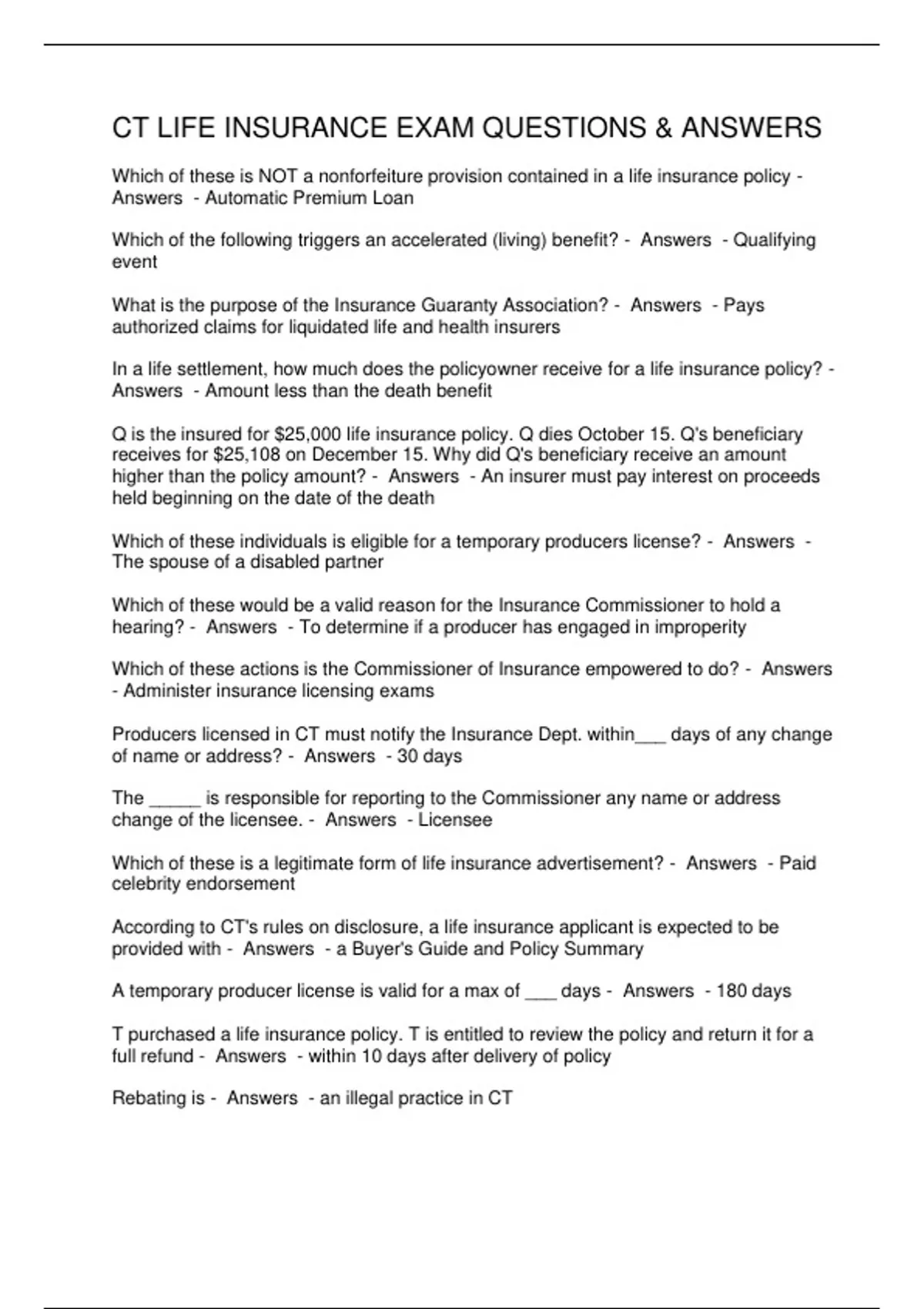 CT LIFE INSURANCE EXAM QUESTIONS & ANSWERS