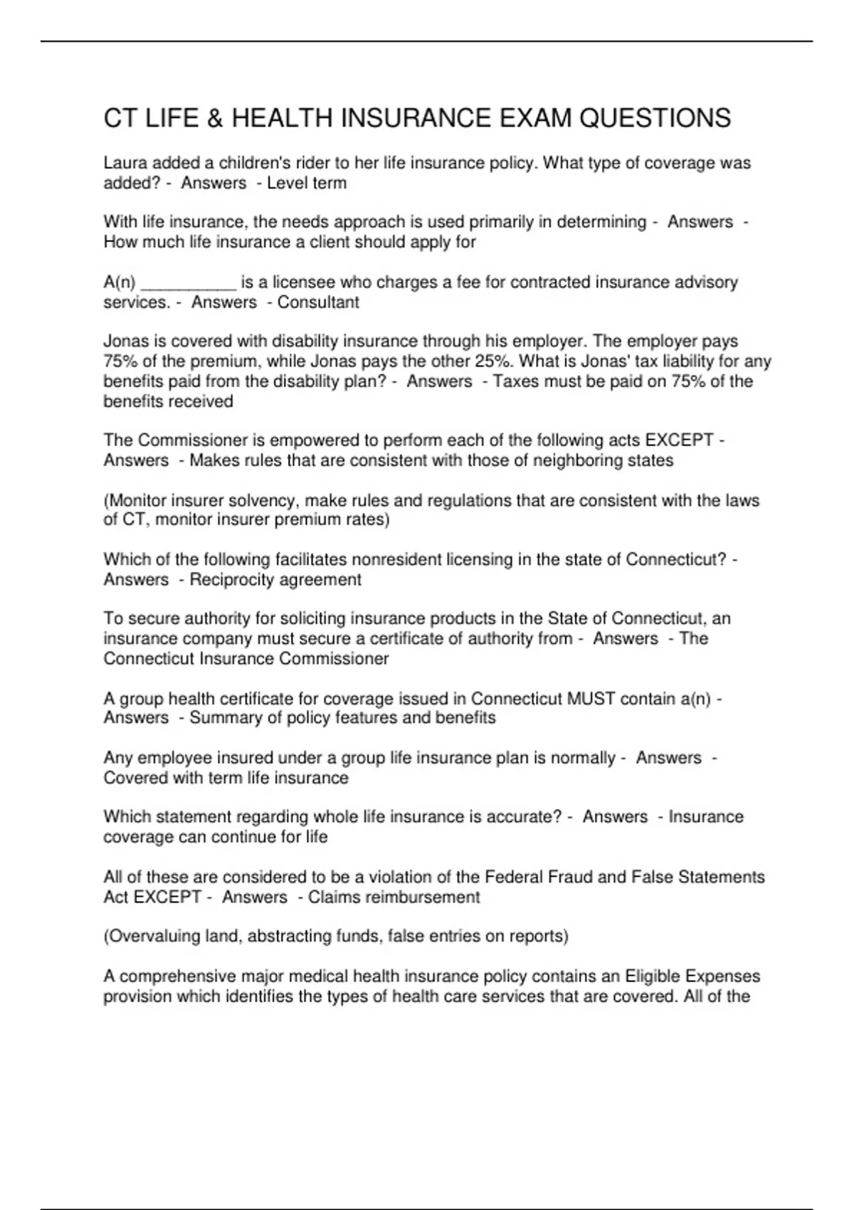 CT LIFE & HEALTH INSURANCE EXAM QUESTIONS
