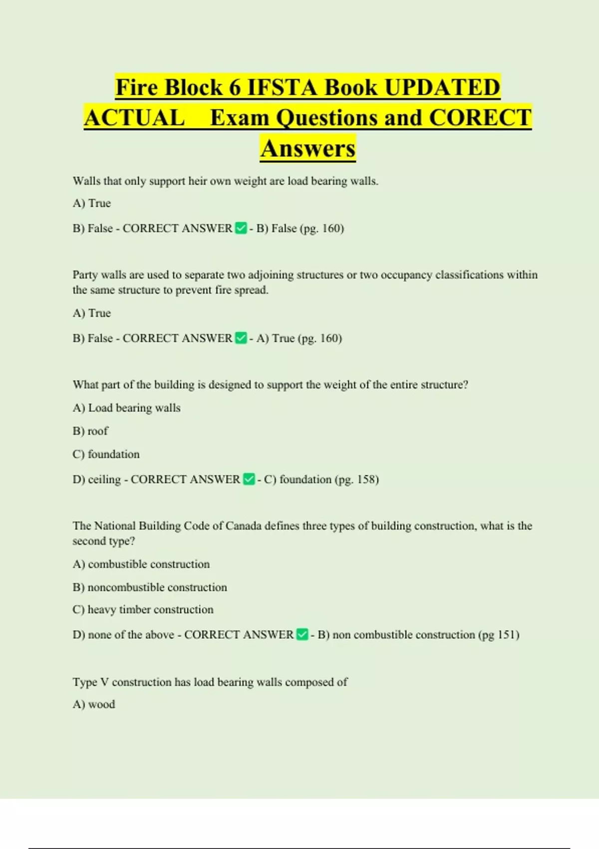 Fire Block 6 IFSTA Book UPDATED ACTUAL Exam Questions and CORECT Answers Walls that only support heir own weight are load bearing walls. A) True B) False - CORRECT ANSWER - B) False (pg. 160) Party walls are used to separate two adjoining structures or two occupancy classifications within the same structure to prevent fire spread. A) True B) False - CORRECT ANSWER - A) True (pg. 160