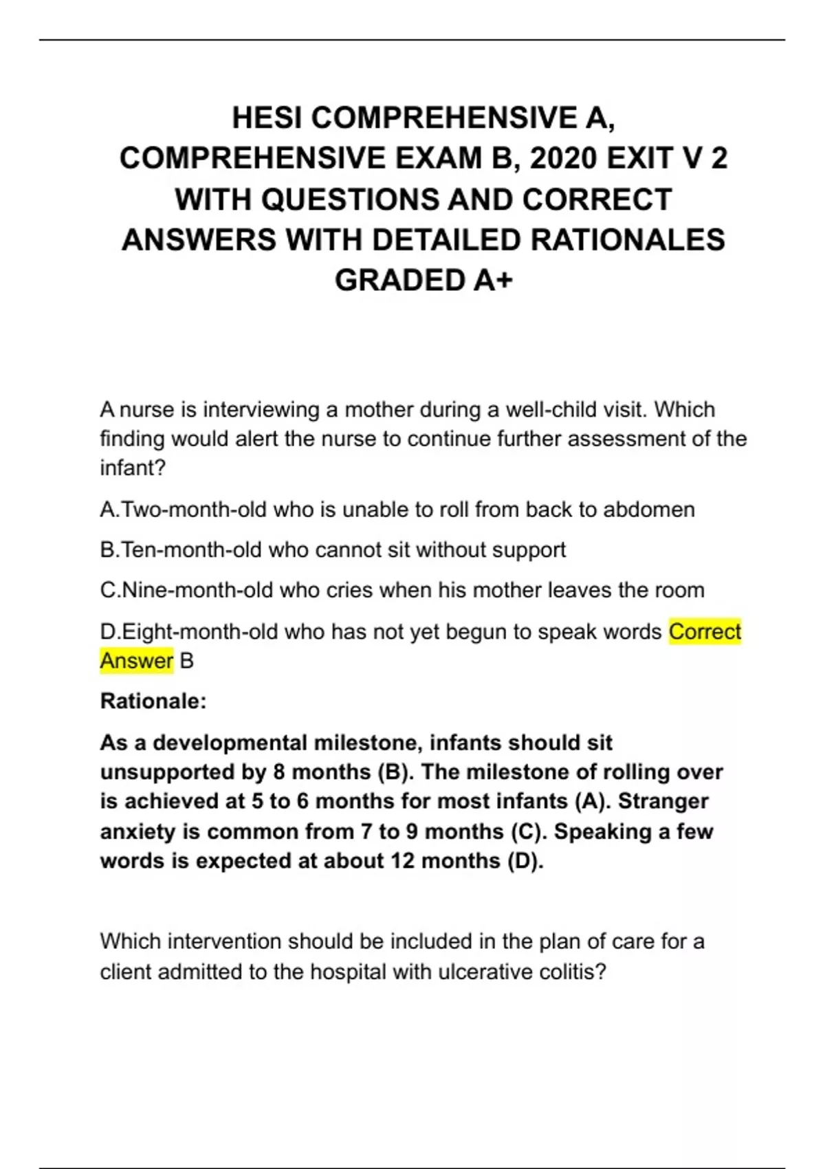 HESI COMPREHENSIVE A, COMPREHENSIVE EXAM B, 2020 EXIT V 2 WITH QUESTIONS AND CORRECT ANSWERS WITH DETAILED RATIONALES GRADED A+