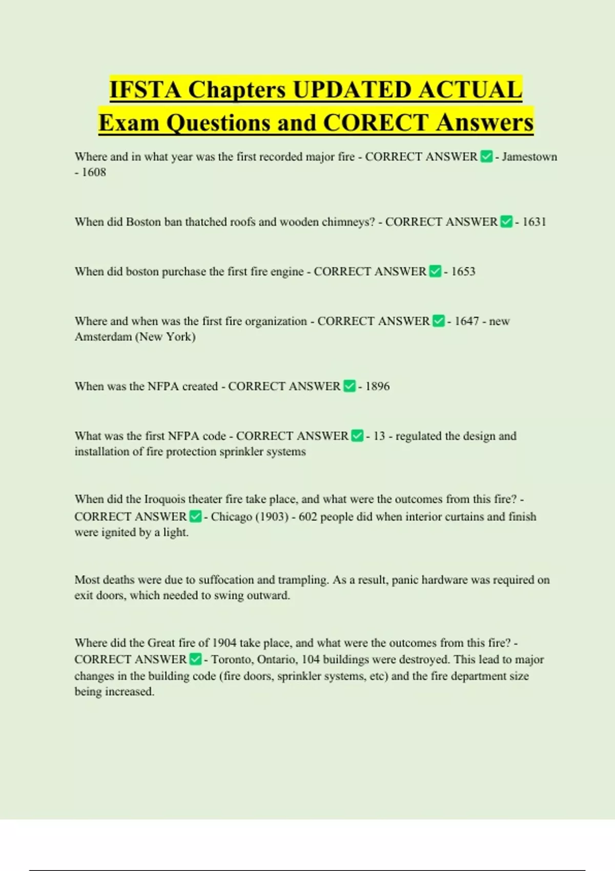 IFSTA Chapters UPDATED ACTUAL Exam Questions and CORECT Answers Where and in what year was the first recorded major fire - CORRECT ANSWER - Jamestown - 1608 When did Boston ban thatched roofs and wooden chimneys? - CORRECT ANSWER - 1631 When did boston purchase the first fire engine - CORRECT ANSWER - 1653 Where and when was the first fire organization - CORRECT ANSWER - 1647 - new