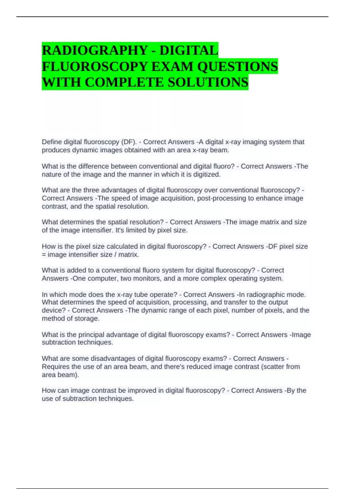Define digital fluoroscopy (DF). - Correct Answers -A digital x-ray imaging system that