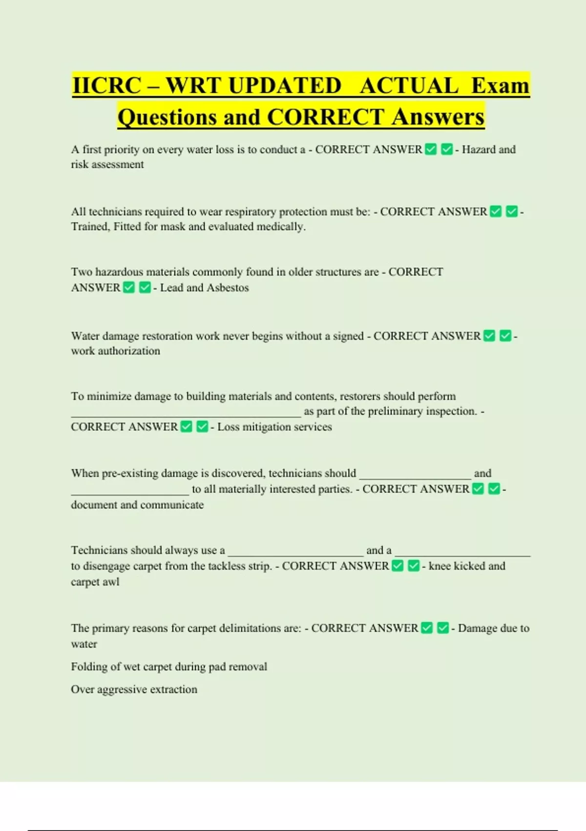 IICRC – WRT UPDATED ACTUAL Exam Questions and CORRECT Answers A first priority on every water loss is to conduct a - CORRECT ANSWER risk assessment - Hazard and All technicians required to wear respiratory protection must be: - CORRECT ANSWER Trained, Fitted for mask and evaluated medically. Two hazardous materials commonly found in older structures are - CORRECT ANSWER - Lead and Asbesto
