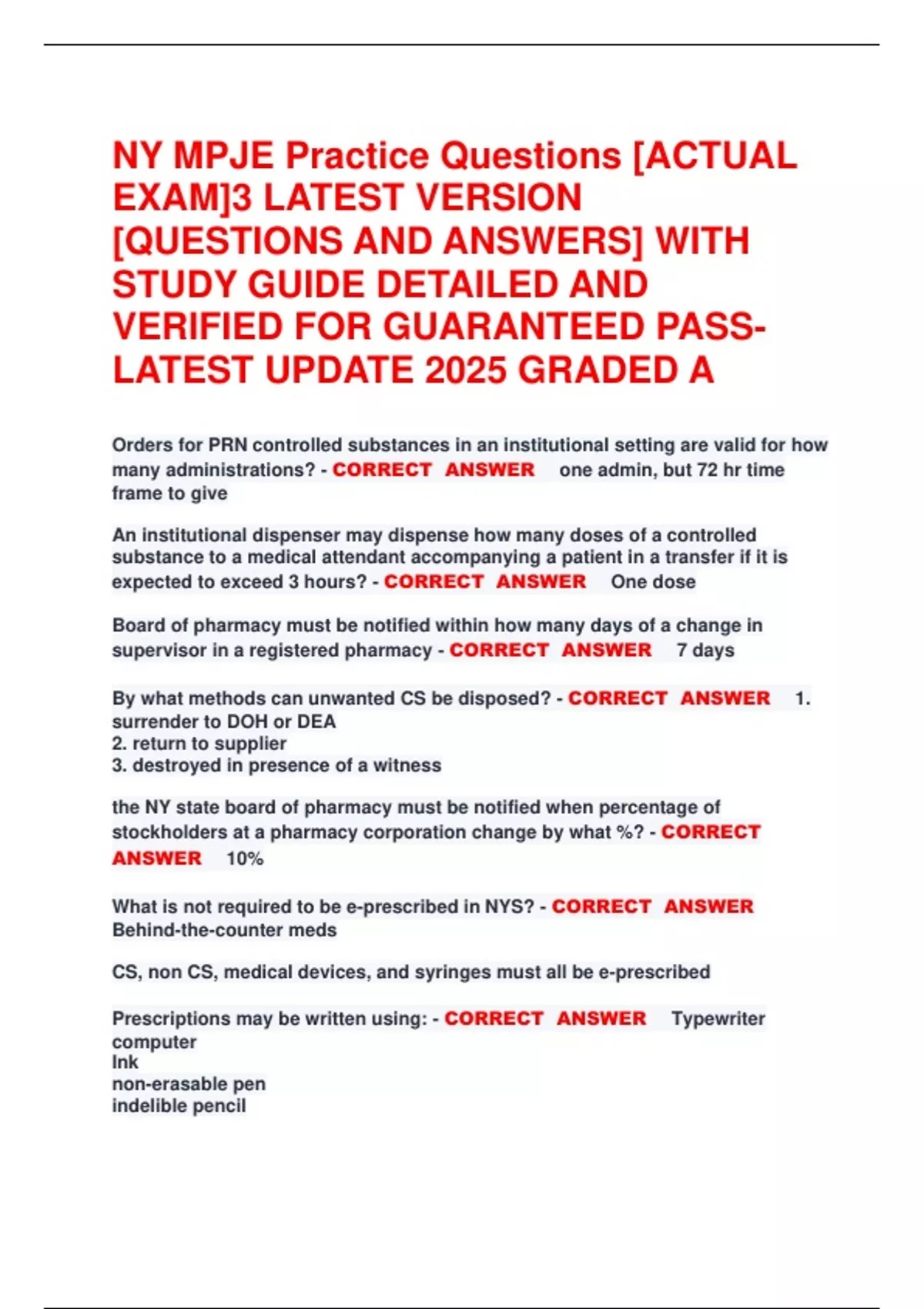 NY MPJE Practice Questions [ACTUAL EXAM]3 LATEST VERSION [QUESTIONS AND ANSWERS] WITH STUDY GUIDE DETAILED AND VERIFIED FOR GUARANTEED PASS- LATEST UPDATE 2025 GRADED A