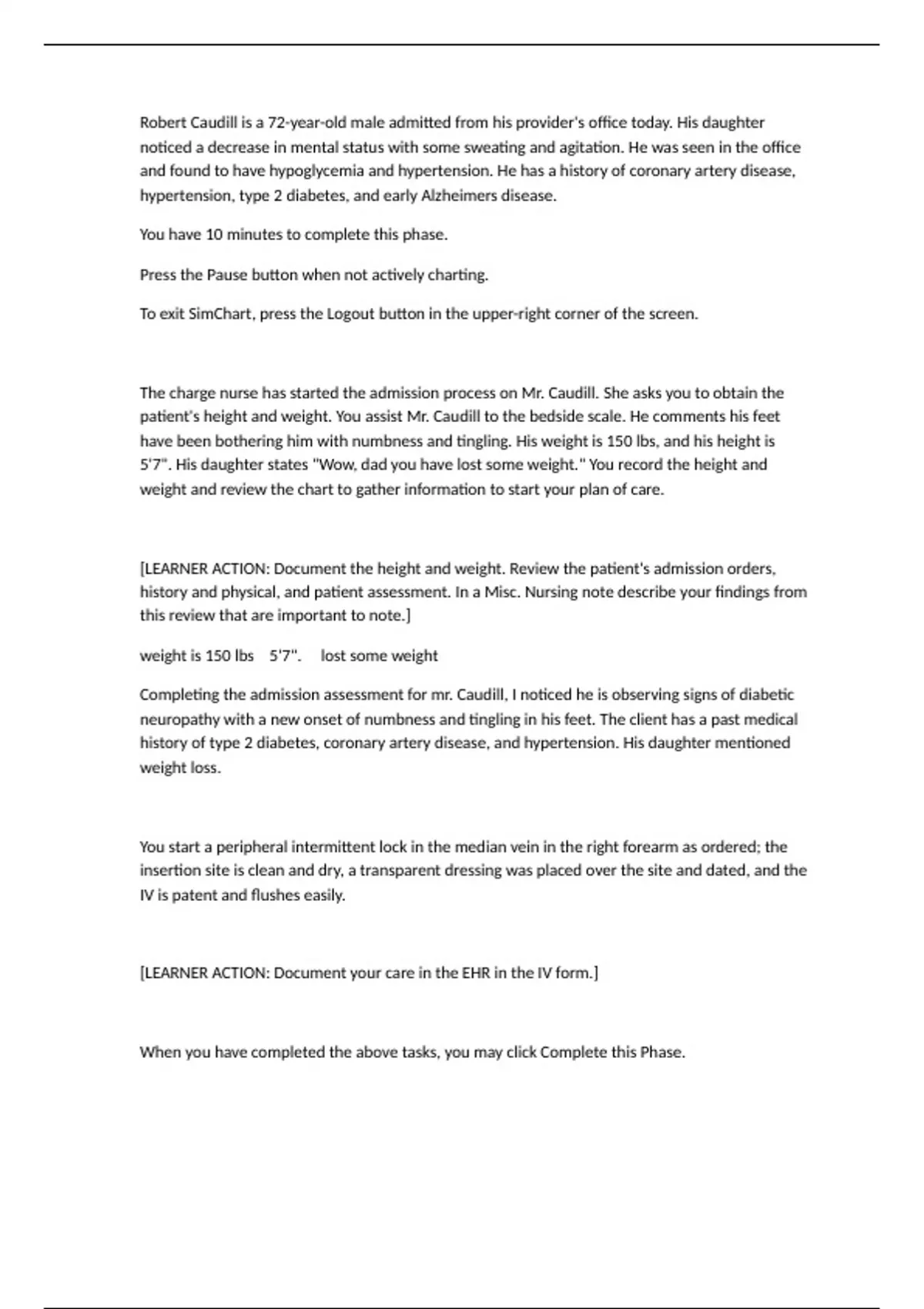 SimChart Robert Caudill glucose_(Answered) Correctly. Robert Caudill is a 72-year-old male admitted from his provider's office today. His daughter noticed a decrease in mental status with some sweating and agitation. He was seen in the office and found to have hypoglycemia and hypertension. He has a history of coronary artery disease, hypertension, type 2 diabetes, and early Alzheimers disease.