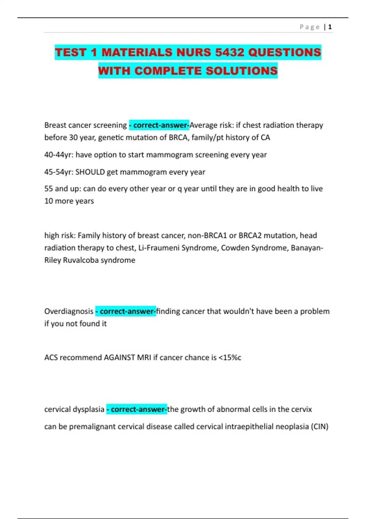 TEST 1 MATERIALS NURS 5432 QUESTIONS