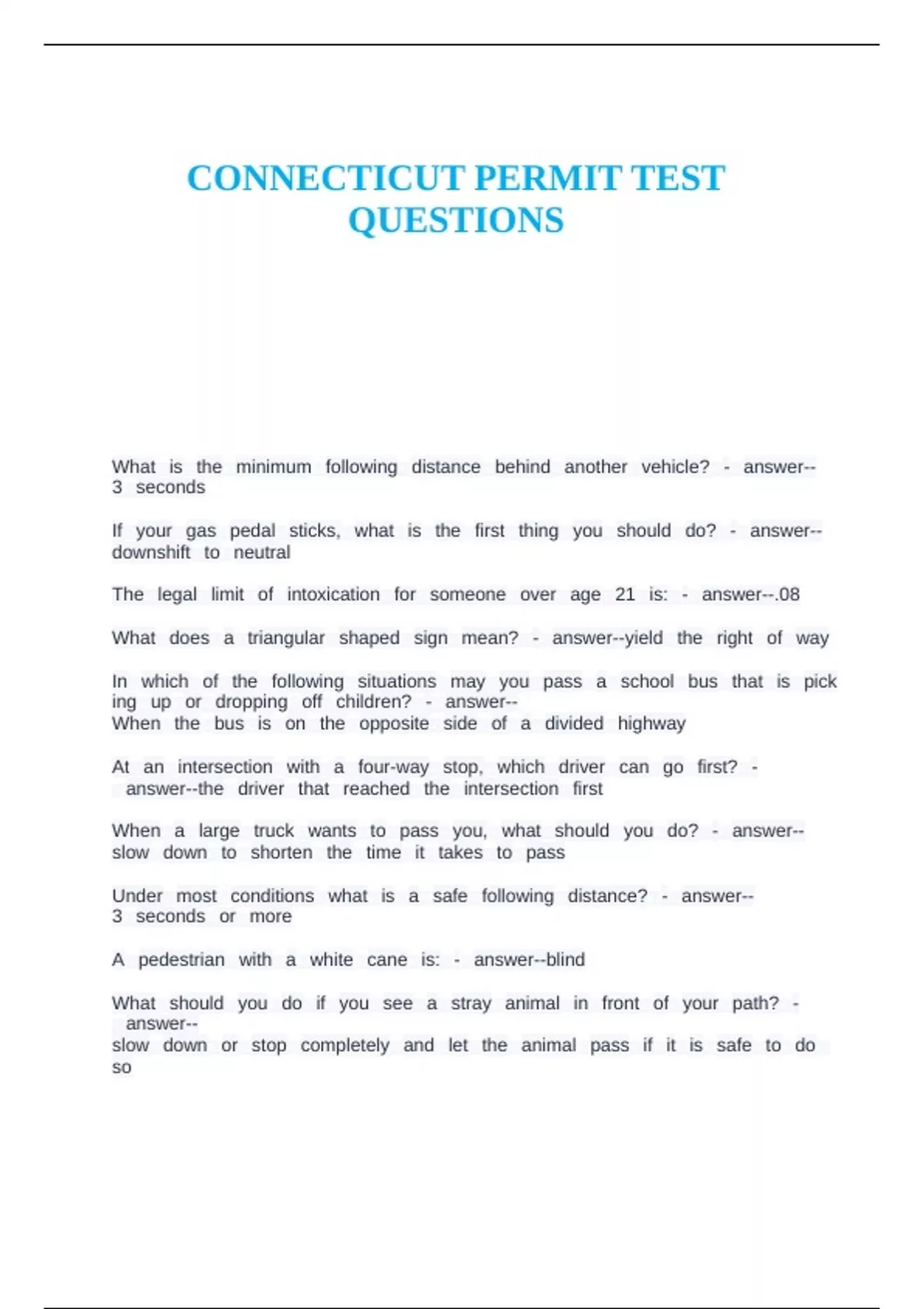 CONNECTICUT PERMIT TEST QUESTIONS.