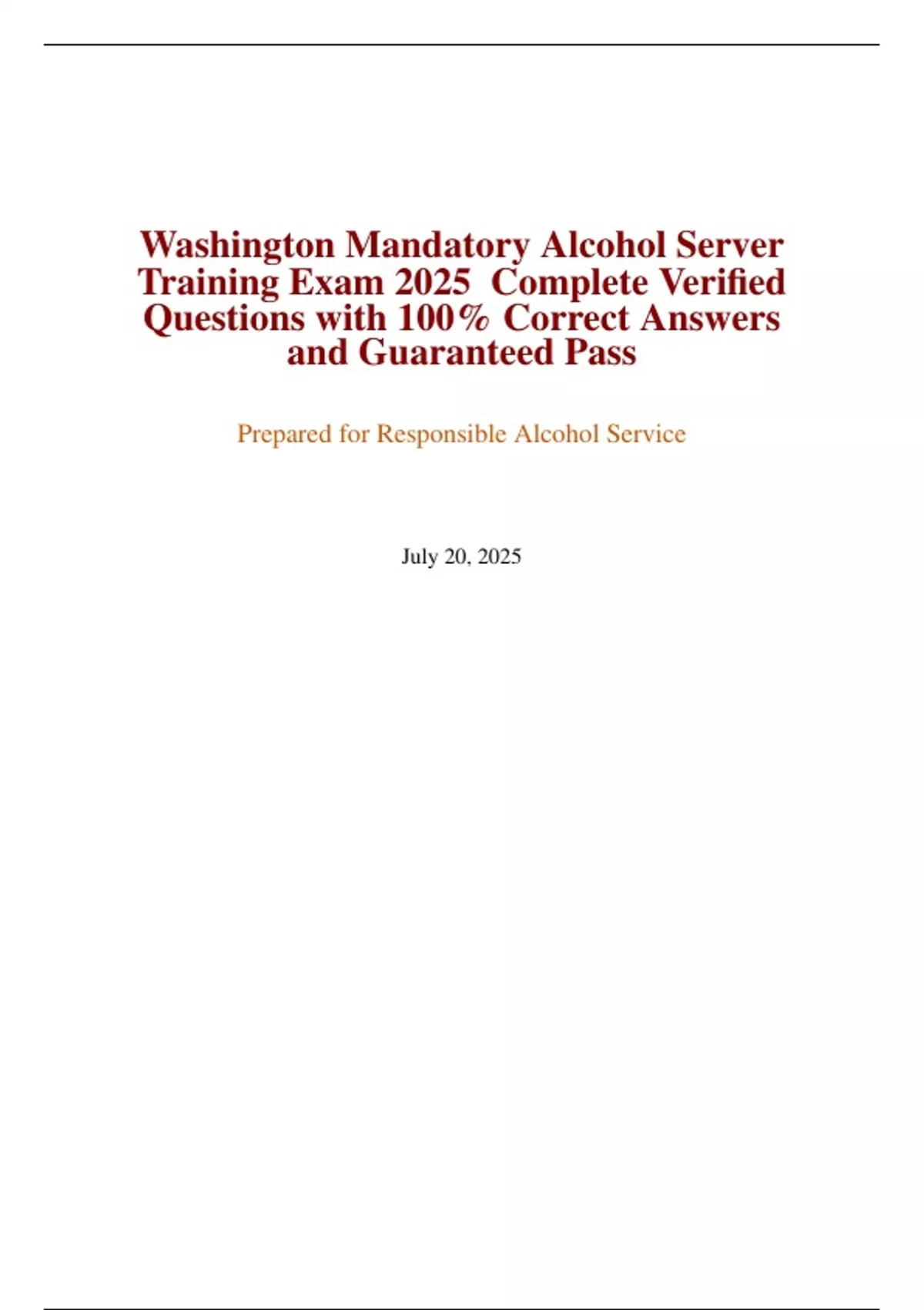 Washington Mandatory Alcohol Server Training Exam 2025 Complete Verified Questions with 100% Correct Answers and Guaranteed Pass Prepared for Responsible Alcohol Service July 20, 2025 Introduction This document provides a comprehensive set of 100 verified questions and detailed answers for the Washington Mandatory Alcohol Server Training (MAST) Exam 2025. Designed to en sure candidates are well-prepared, it focuses on critical topics such as Washington state liquor laws, responsible alcohol service, identification verification, and intoxication management. The questions are streamlined for clarity, avoiding unnecessary jargon, and align with Washington State Liquor and Cannabis Board (WSLCB) standards. Each question is highlighted in a very dark royal orange for emphasis, and answers include detailed rationales to enhance understanding.