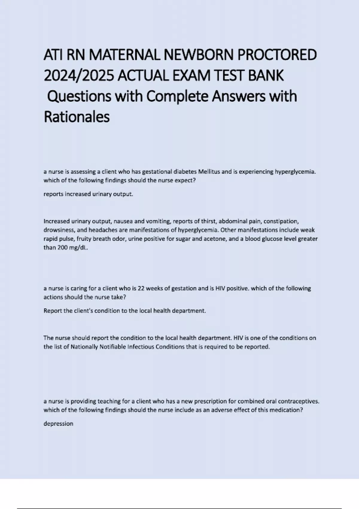 ATI RN MATERNAL NEWBORN PROCTORED ACTUAL EXAM TEST BANK Questions with answers