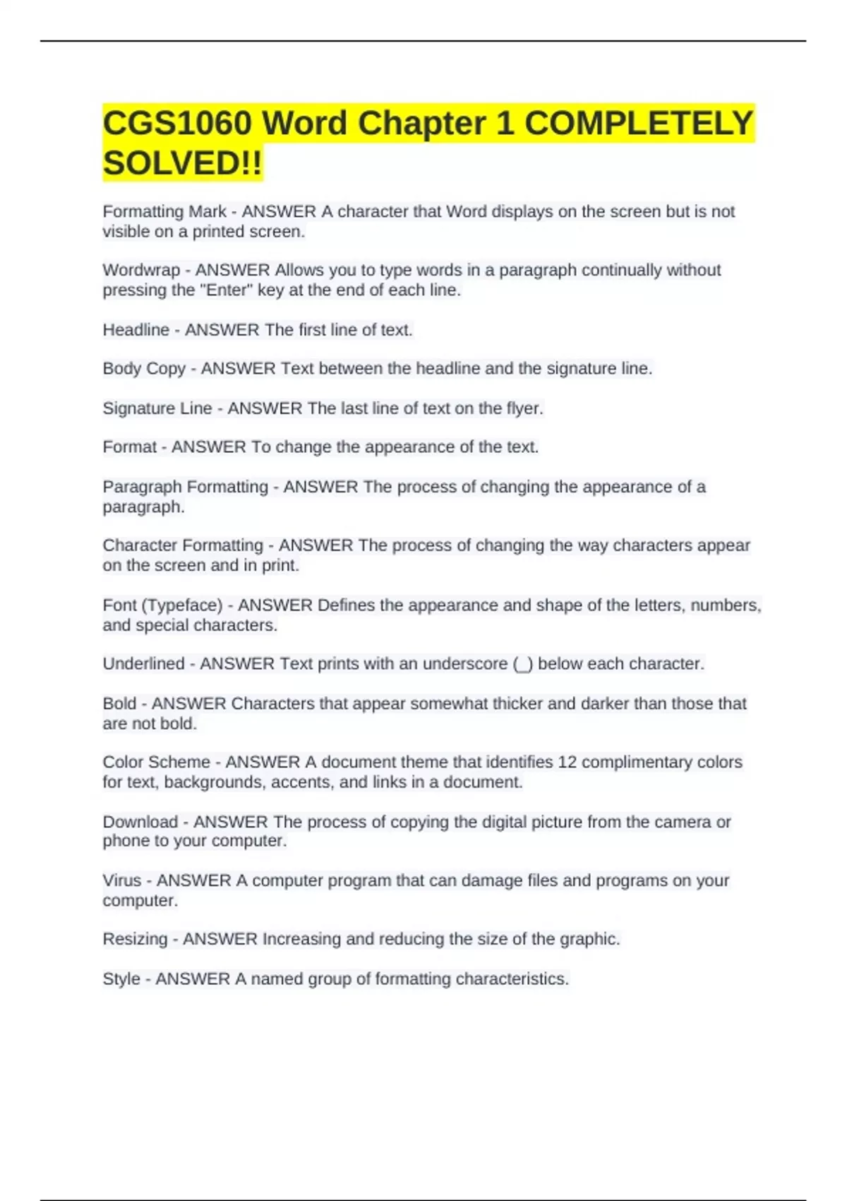 Formatting Mark - ANSWER A character that Word displays on the screen but is not