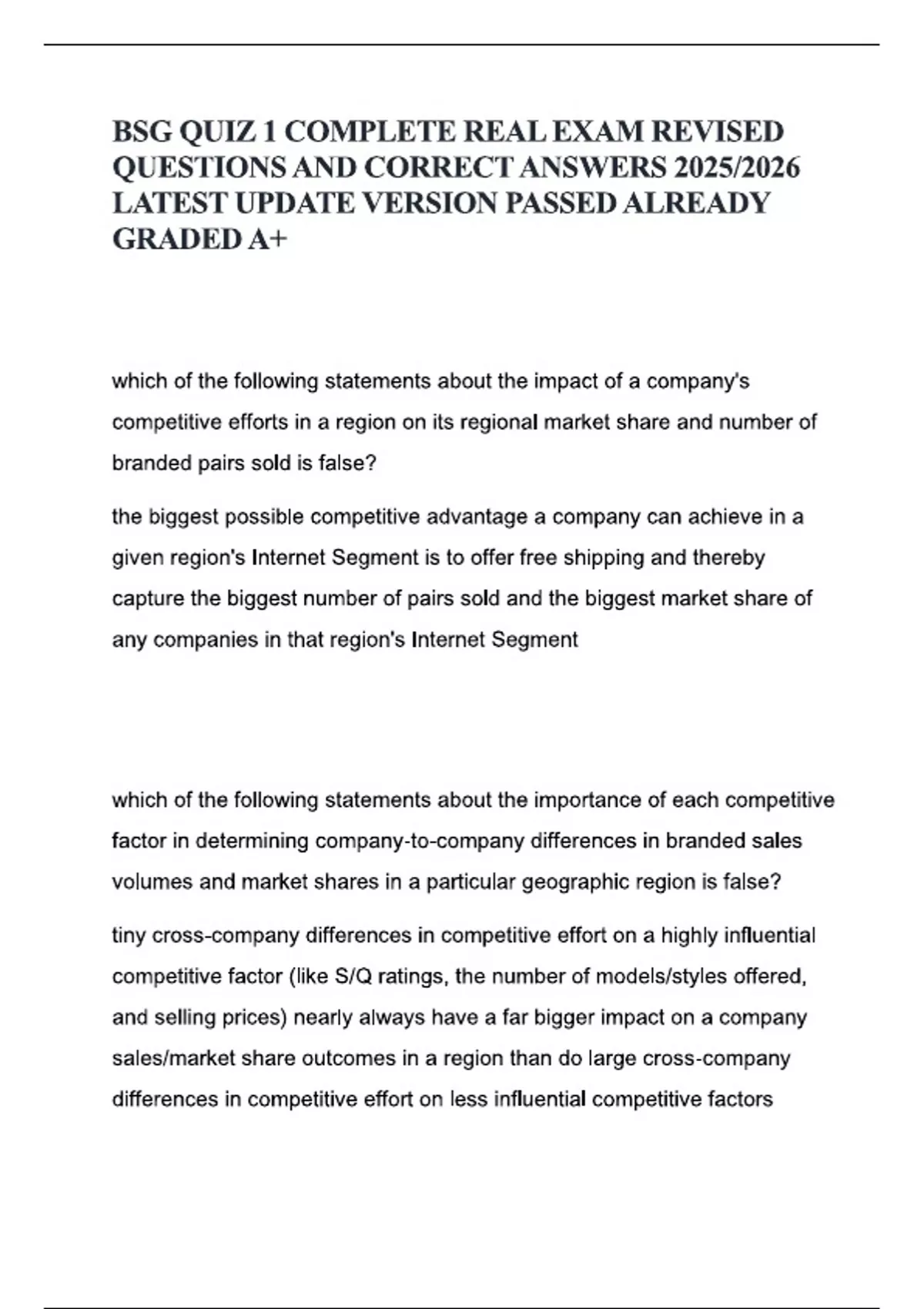 BSG QUIZ 1 COMPLETE REAL EXAM REVISED QUESTIONS AND CORRECT ANSWERS