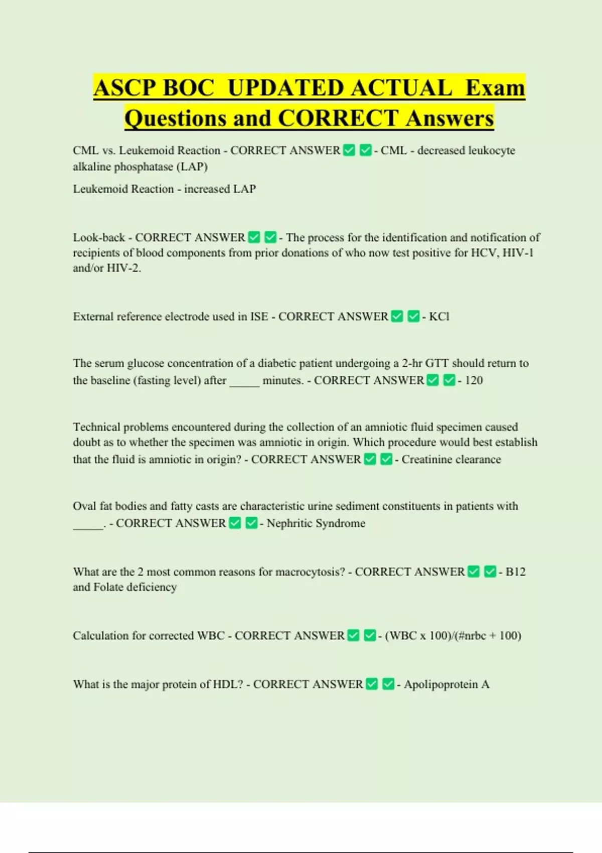 Calculation for corrected WBC - CORRECT ANSWER - (WBC x 100)/(#nrbc + 100)