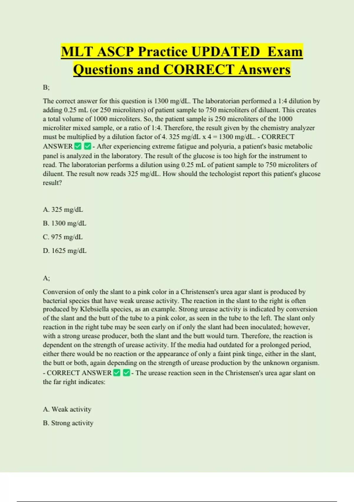 MLT ASCP Practice UPDATED Exam Questions and CORRECT Answers B; The correct answer for this question is 1300 mg/dL. The laboratorian performed a 1:4 dilution by adding 0.25 mL (or 250 microliters) of patient sample to 750 microliters of diluent. This creates a total volume of 1000 microliters. So, the patient sample is 250 microliters of the 1000 microliter mixed sample, or a ratio of 1:4. Therefore, the result given by the chemistry analyzer must be multiplied by a dilution factor of 4. 325 mg/dL x 4 = 1300 mg/dL. - CORRECT ANSWER - After experiencing extreme fatigue and polyuria, a patient's basic metabolic panel is analyzed in the laboratory. The result of the glucose is too high for the instrument to read. The laboratorian performs a dilution using 0.25 mL of patient sample to 750 microliters of diluent. The result now reads 325 mg/dL. How should the techologist report this patient's glucose result?