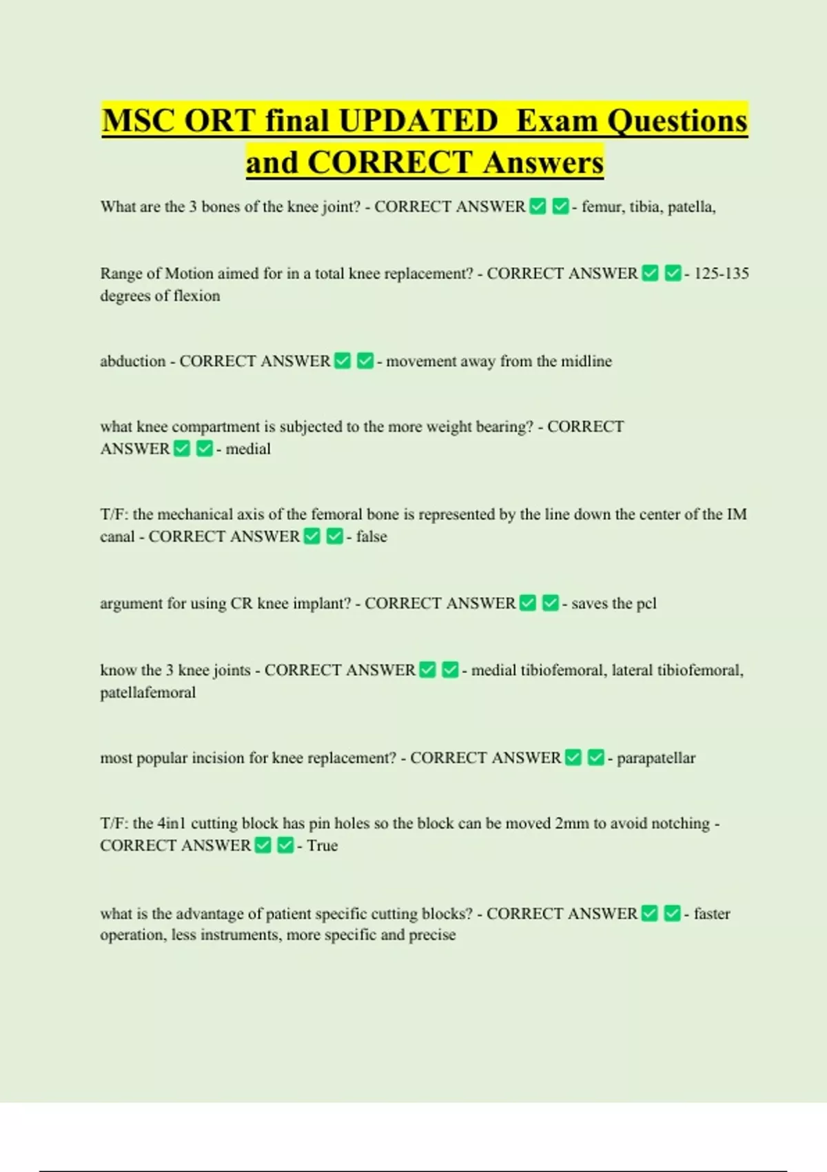 MSC ORT final UPDATED Exam Questions and CORRECT Answers What are the 3 bones of the knee joint? - CORRECT ANSWER - femur, tibia, patella, Range of Motion aimed for in a total knee replacement? - CORRECT ANSWER degrees of flexion abduction - CORRECT ANSWER - movement away from the midline what knee compartment is subjected to the more weight bearing? - CORRECT ANSWER - medial