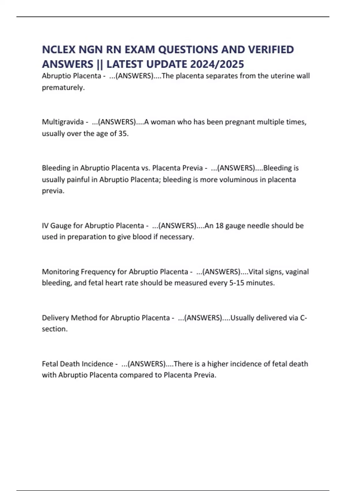 Abruptio Placenta - ...(ANSWERS)....The placenta separates from the uterine wall