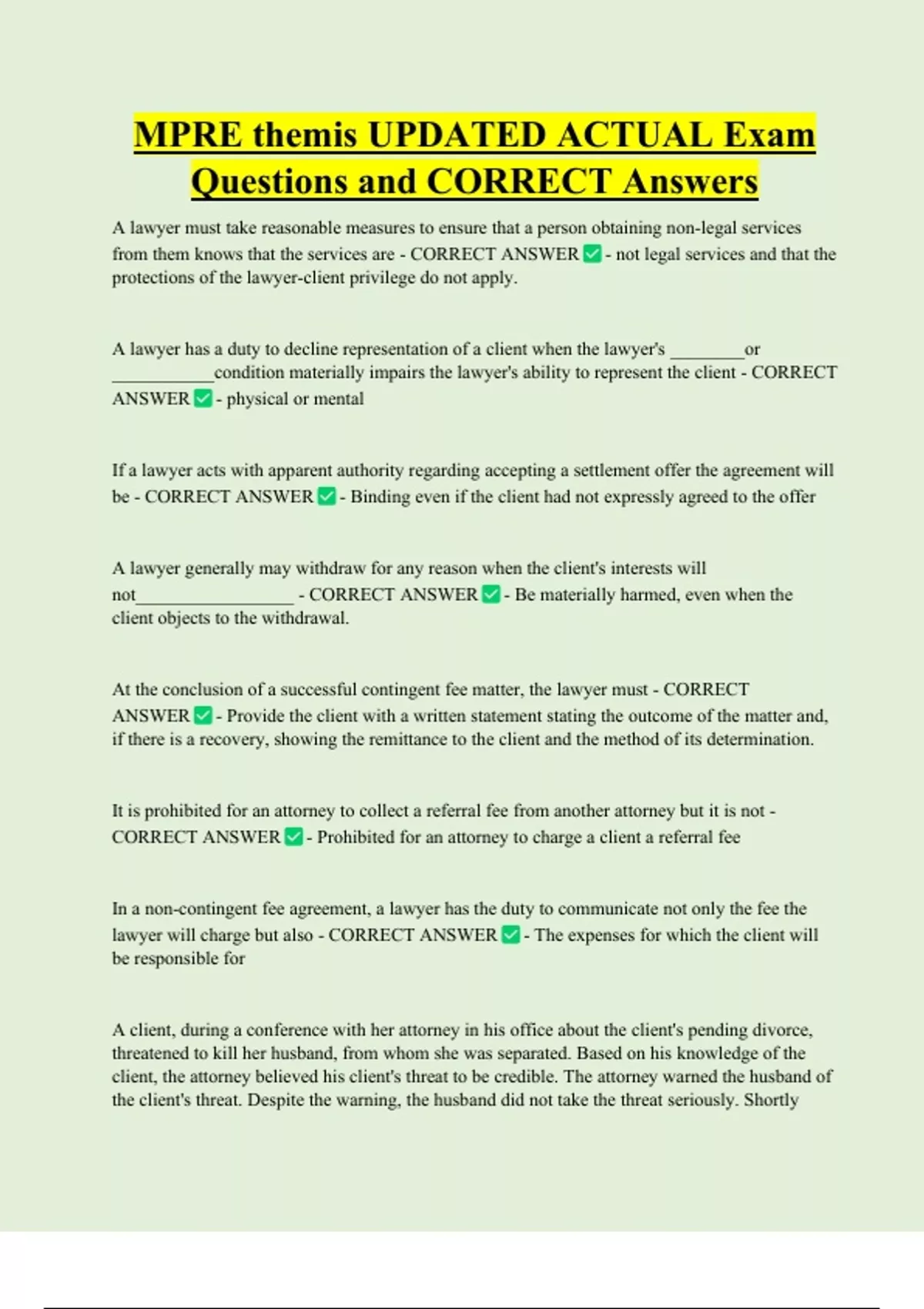 MPRE themis UPDATED ACTUAL Exam Questions and CORRECT Answers A lawyer must take reasonable measures to ensure that a person obtaining non-legal services from them knows that the services are - CORRECT ANSWER - not legal services and that the protections of the lawyer-client privilege do not apply. A lawyer has a duty to decline representation of a client when the lawyer's ________or ___________condition materially impairs the lawyer's ability to represent the client - CORRECT ANSWER - physical or mental