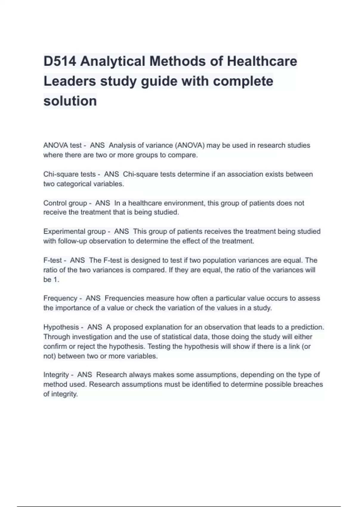 D514 Analytical Methods of Healthcare Leaders study guide with complete solution