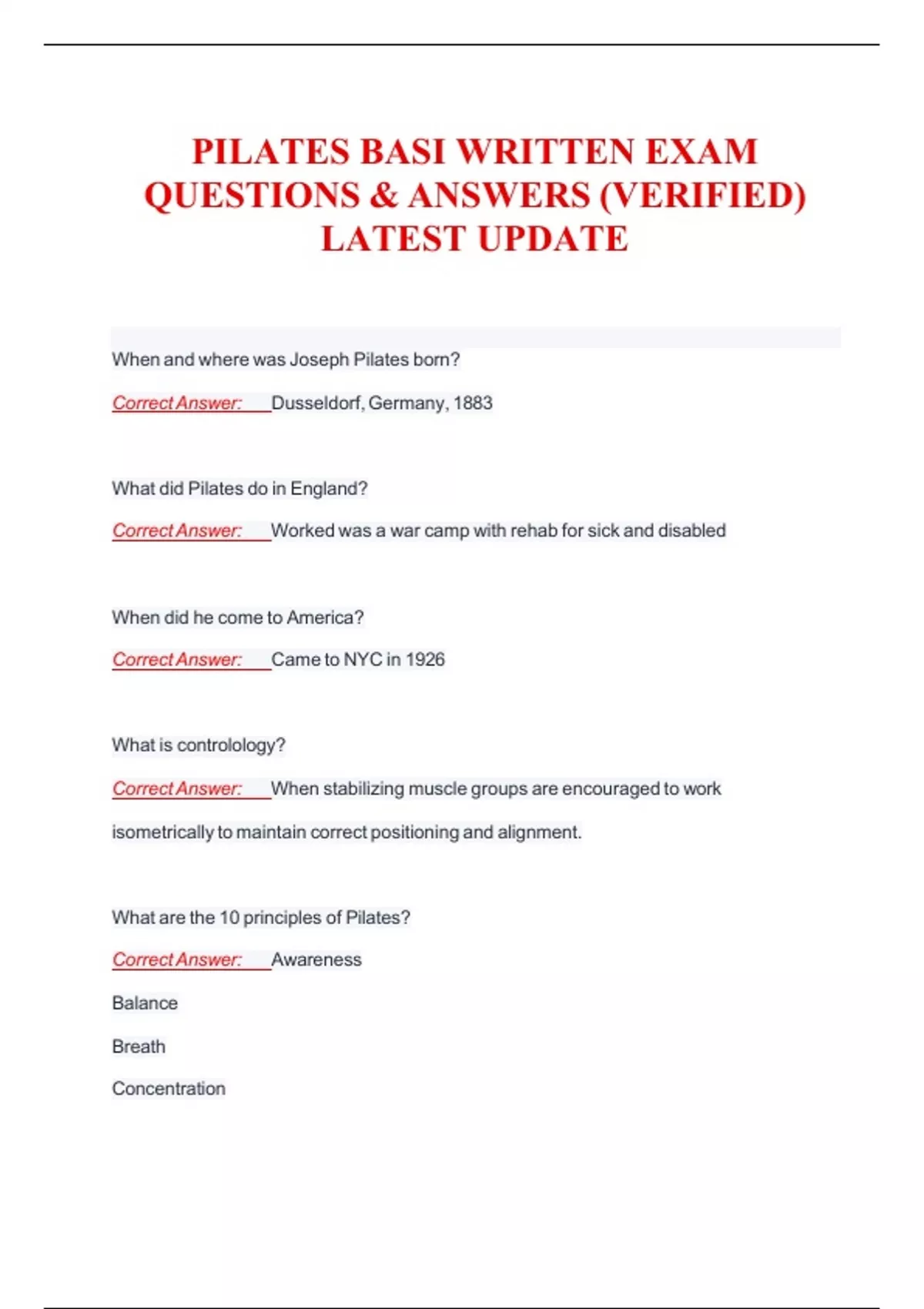 PILATES BASI WRITTEN EXAM QUESTIONS & ANSWERS (VERIFIED) LATEST UPDATE
