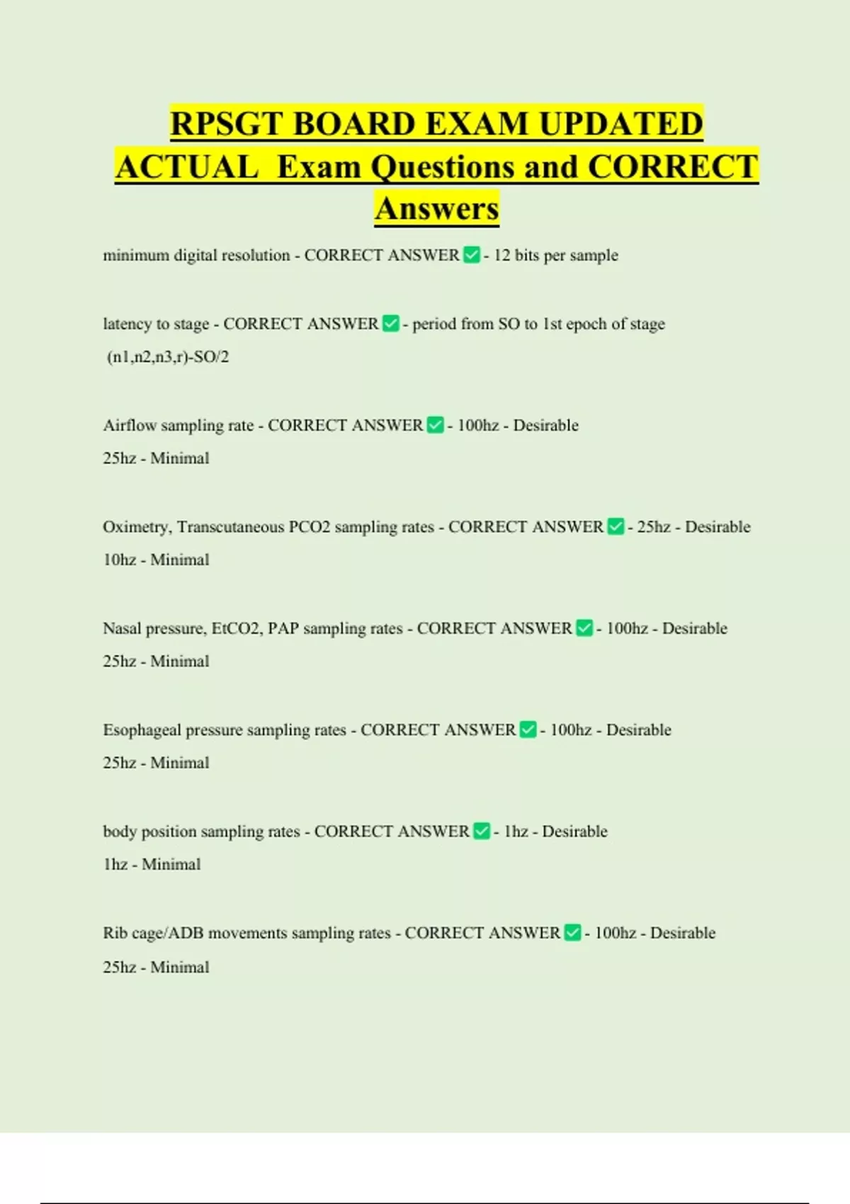 RPSGT BOARD EXAM UPDATED ACTUAL Exam Questions and CORRECT Answers minimum digital resolution - CORRECT ANSWER - 12 bits per sample latency to stage - CORRECT ANSWER - period from SO to 1st epoch of stage (n1,n2,n3,r)-SO/2 Airflow sampling rate - CORRECT ANSWER - 100hz - Desirable 25hz - Minimal Oximetry, Transcutaneous PCO2 sampling rates - CORRECT ANSWER - 25hz - Desirabl
