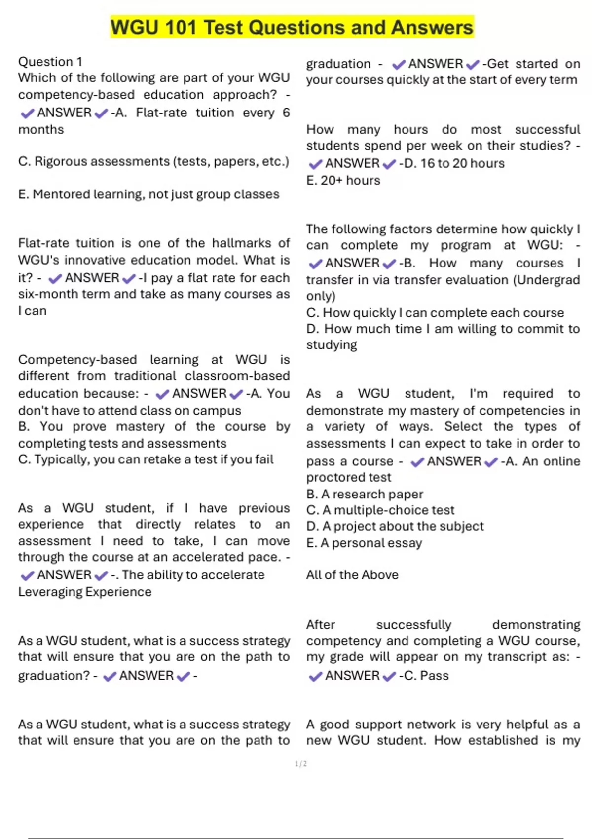 Question 1 Which of the following are part of your WGU competency-based education approach? - ANSWER -A. Flat-rate tuition every 6 months C. Rigorous assessments (tests, papers, etc.) E. Mentored learning, not just group classes Flat-rate tuition is one of the hallmarks of WGU's innovative education model. What is it? - ANSWER -I pay a flat rate for each six-month term and take as many courses as I can Competency-based learning at WGU is different from traditional classroom-based education because: - ANSWER -A. You don't have to attend class on campus B. You prove mastery of the course by completing tests and assessments C. Typically,