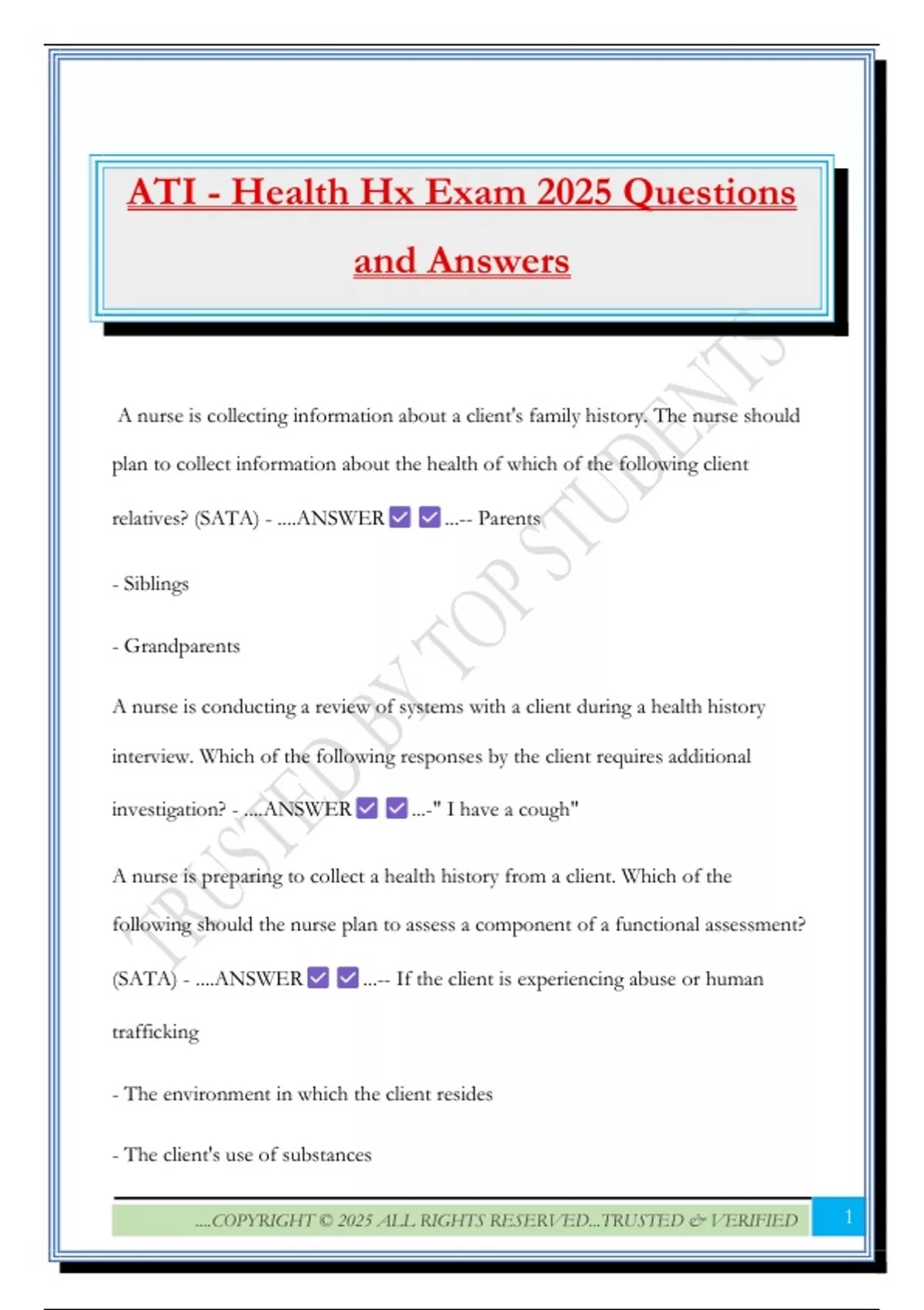 ATI - Health Hx Exam 2025 Questions
