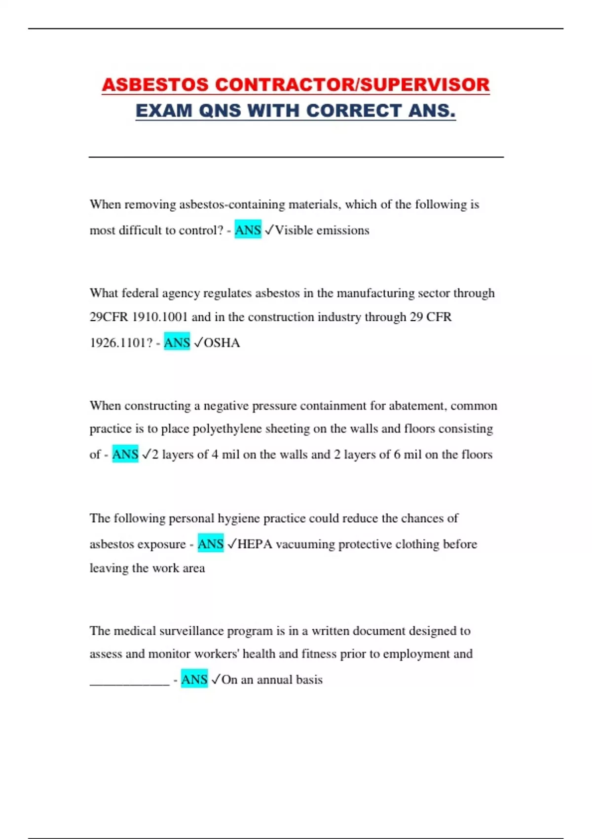 This document provides a comprehensive set of exam questions and correct answers for the Asbestos Contractor/Supervisor certification. It includes questions related to OSHA and EPA regulations, negative pressure enclosures, respiratory protection, medical surveillance, waste handling, and air monitoring. The material is ideal for individuals preparing for licensure or certification in asbestos abatement supervision and aligns with regulatory standards like 29 CFR 1926.1101 and AHERA.