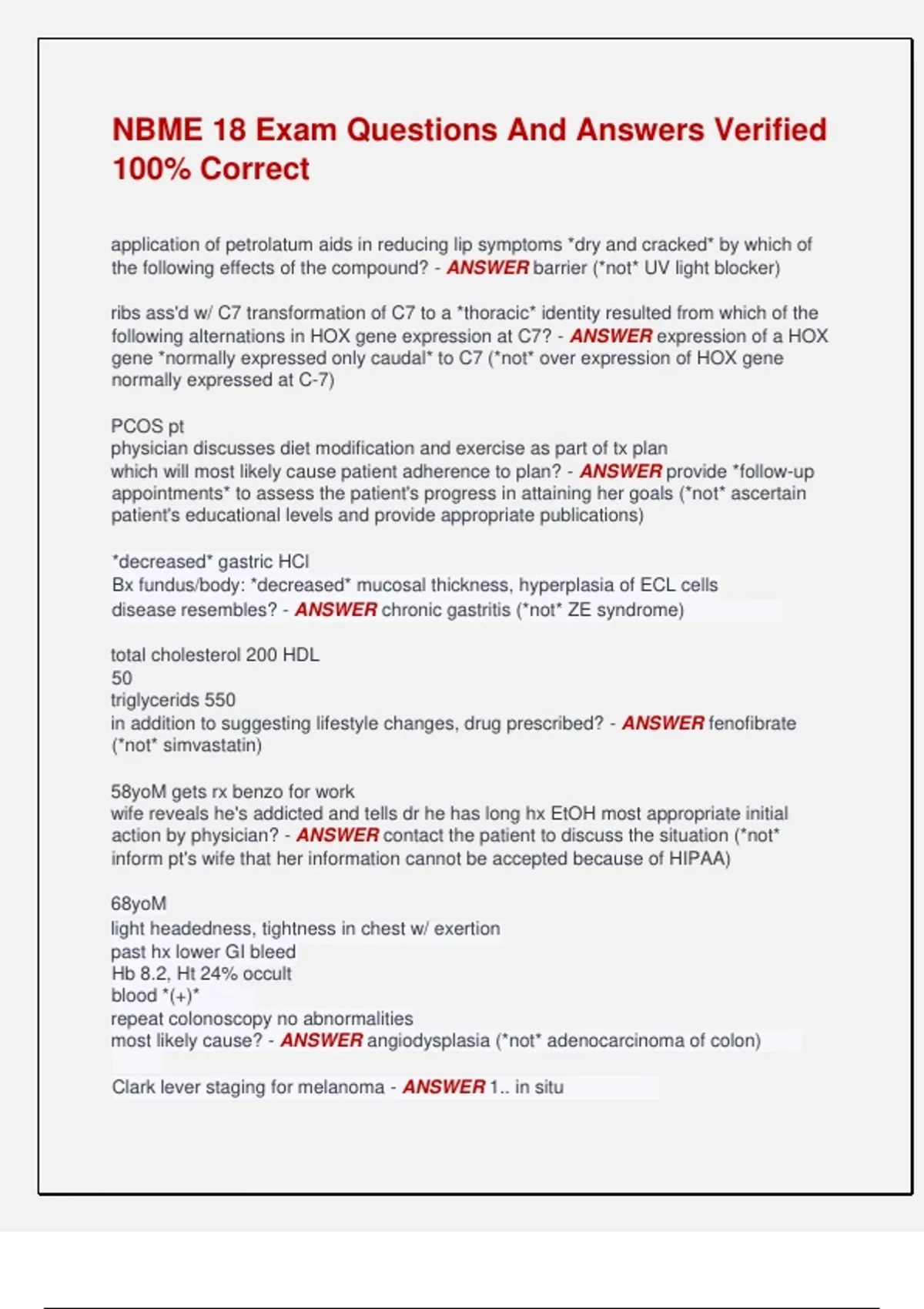 NBME 18 Exam Questions And Answers Verified 100% Correct application of petrolatum aids in reducing lip symptoms *dry and cracked* by which of the following effects of the compound? - ANSWER barrier (*not* UV light blocker) ribs ass'd w/ C7 transformation of C7 to a *thoracic* identity resulted from which of the following alternations in HOX gene expression at C7? - ANSWER expression of a HOX gene *normally expressed only caudal* to C7 (*not* over expression of HOX gene normally expressed at C-7) PCOS pt physician discusses diet modification and exercise as part of tx plan which will most likely cause patient adherence to plan? - ANSWER provide *follow-up appointments* to assess the patient's progress in attaining her goals (*not* ascertain patient's educational levels and provide appropriate publications) *decreased* gastric HCl Bx fundus/body: *decreased* mucosal thickness, hyperplasia of ECL cells disease resembles? - ANSWER chronic gastritis (*not* ZE syndrome) total cholesterol 200 HDL 50 triglycerids 550 in addition to suggesting lifestyle changes, drug prescribed? - ANSWER fenofibrate (*not* simvastatin) 58yoM gets rx benzo for work wife reveals he's addicted and tells dr he has long hx EtOH most appropriate initial action by physician? - ANSWER contact the patient to discuss the situation (*not* inform pt's wife that her information cannot be accepted because of HIPAA) 68yoM light headedness, tightness in chest w/ exertion past hx lower GI bleed Hb 8.2, Ht 24% occult blood *(+)* repeat colonoscopy no abnormalities most likely cause? - ANSWER angiodysplasia (*not* adenocarcinoma of colon) Clark lever staging for melanoma - ANSWER 1.. in situ 2. in papillary dermis 3. expands papillary dermis 4. in reticular dermis 5. invades subQ tissue involvement of which skin layer is associated w/ *greatest risk* for unfavorable prognosis of melanoma - ANSWER subcutaneous tissue (*not* basement membrane) male fetus collecting system and pelvis of L kidney *dilated* renal cortex appears *compressed* L/R ureters *not* dilated R kidney *normal* normal amniotic fluid volume most likely cause of renal findings? - ANSWER incomplete recanalization of proximal ureter (*not* ectopic ureter) 24yoM progressive numbness of both feet ascended to level of thighs mild weakness of distal upper extremities/moderate weakness of lower extremities what is involved? - ANSWER *myelinated* primary afferents (*not* fasciculus gracilis) Guillan Barre affects *MYELIN* 52 yo woman with breast cancer comes for follow up. She had 4 week course of radiation treatment 6 months ago. Her respirations are 26/min. PE shows no recurrence of the cancer. CT scan shows *bilateral patches of atelectasis* in the upper lung fields. The atelectasis in this patient most likely developed because of *which of the following primary pathophysiologic processes?* - ANSWER contraction due to radiation therapy --> fibrosis (*not obstruction) A 25-year-old woman comes to the physician because of a 2-year history of *intermittent, diffuse, cramping lower abdominal pain*. The pain is usually associated with 2 to 6 days of *loose, watery stools*, and is typically relieved with defecation... A drug targeting which of the following mechanisms of action is most appropriate for this patient? - ANSWER accentuation of mu-opiod myenteric plexus receptor (*not* inhibition of tumor necrosis factor-alpha) In a study designed to test the effectiveness of a new drug in the treatment of endometriosis, 100 women randomly assigned to one of two groups. 48 of women receive new drug 52 receive standard therapy The primary purpose of this method of assigning patients to different groups is to create which of the following ? - ANSWER two groups w/ similar underlying characteristics (*not* w/ similar sample size) 33-year-old man dx with *epilepsy* age 10 years. Most recent generalized tonic-clonic was 5 years ago. Medication was adjusted. Current meds include *carbamazepine*. He's never had any collisions while driving his motor vehicle. Patient's status with respect to driving? - ANSWER he is *medically qualified* to drive (*not* not medically qualified to drive while he takes carbamazepine) you can drive once you are *seizure free* for 6 months An 82 year old woman comes to the physician because of constant severe lower abdominal pain and fever for 24 hours. Laproscopic examination shows severe diverticulosis and perforated diverticulitis. In spite of appropriate therapy she dies 2 days later. Her liver autopsy was given Which of the following is the primary component of the material shown on the hepatic surface - ANSWER fibrin (*not* collagen type III) perf'd diverticuli = *poop* in belly = tons of *inflammation* = *fibrin* A 21-year old woman comes to the physician because of 10-day history of difficulty walking. Two years ago, she had loss of vision int he left eye which improved over 2 months. Neurologic examination shows decreased visual acuity in the left eye with pallor of optic disc. She has past-pointing on a finger-nose test. She has a broad-based gait. An MRI of the brain shows lesion in the white matter of cerebellum. Which of the following describes the pathogenesis of the disease process in this patient? - ANSWER CD4+ T lymphocytes are activated by myelin basic protein (*not* CD8+ T lymphocytes kill astrocytes) MS is type IV HSR: demyelinating disease involving *myelin basic protein* 50-year-old man with pulmonary embolus. Treated with intravenous heparin. 24 hours later, warfarin added. Day 2, partial thromboplastin time is 52 seconds (control 26 sec), and prothrombin time is 12 seconds (control 12.1 sec; INR = 1). Best explanation for normal prothrombin time and INR? - ANSWER long half-life of factor II (prothrombin) (*not* hereditary resistance to warfarin) half life of *PT (Factor II)* is *60 hours*, longest of them all so it *takes time to actually increase the PT* 36-year-old woman diagnosed with *HIV*. Two months ago, started antiretroviral ther