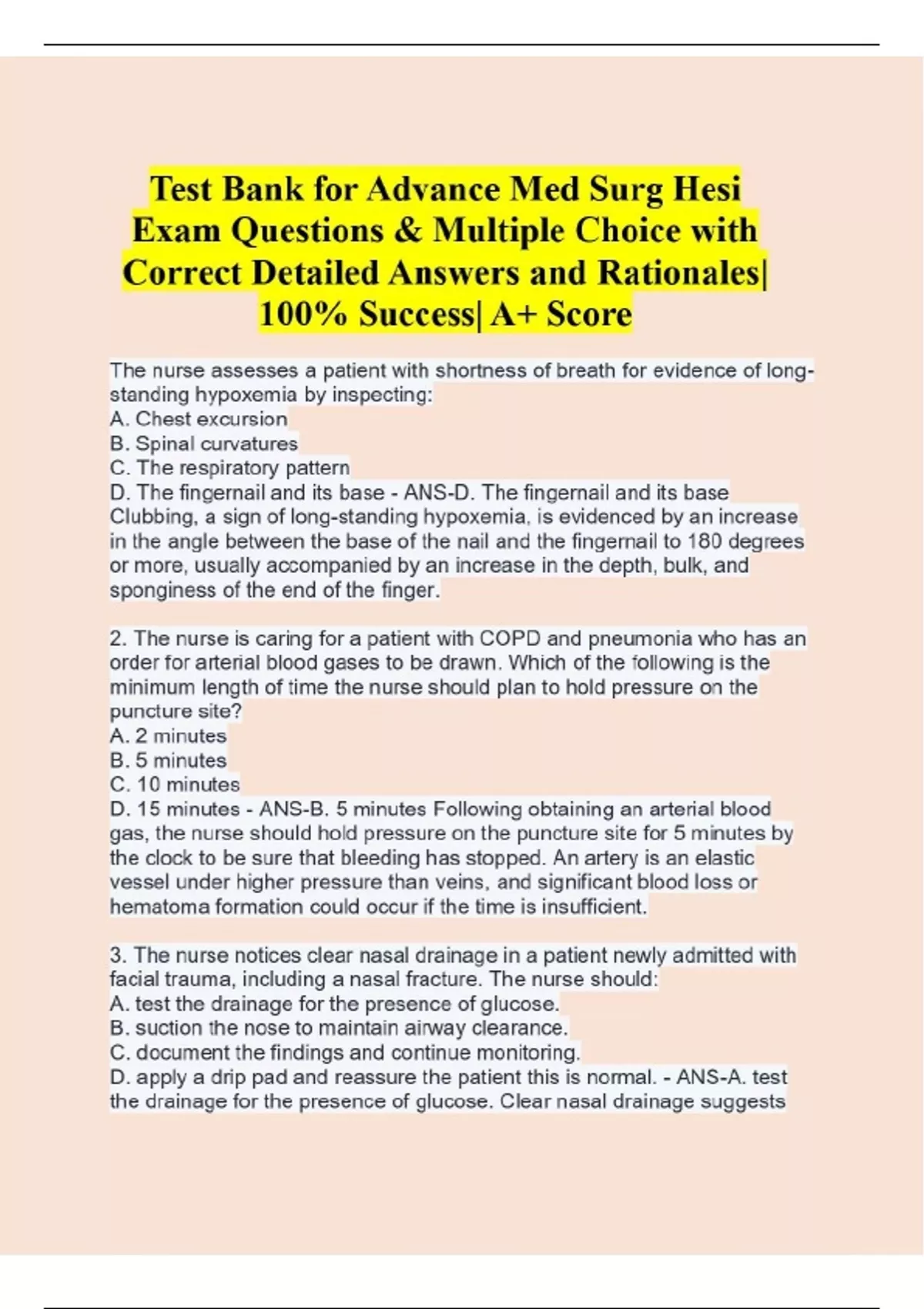 Test Bank for Advance Med Surg Hesi Exam Questions & Multiple Choice with Correct Detailed Answers and Rationales| 100% Success| A+ Score The nurse assesses a patient with shortness of breath for evidence of long-standing hypoxemia by inspecting: A. Chest excursion B. Spinal curvatures C. The respiratory pattern D. The fingernail and its base - ANS-D. The fingernail and its base Clubbing, a sign of long-standing hypoxemia, is evidenced by an increase in the angle between the base of the nail and the fingernail to 180 degrees or more, usually accompanied by an increase in the depth, bulk, and sponginess of the end of the finger. 2. The nurse is caring for a patient with COPD and pneumonia who has an order for arterial blood gases to be drawn. Which of the following is the minimum length of time the nurse should plan to hold pressure on the puncture site? A. 2 minutes B. 5 minutes C. 10 minutes D. 15 minutes - ANS-B. 5 minutes Following obtaining an arterial blood gas, the nurse should hold pressure on the puncture site for 5 minutes by the clock to be sure that bleeding has stopped. An artery is an elastic vessel under higher pressure than veins, and significant blood loss or hematoma formation could occur if the time is insufficient. 3. The nurse notices clear nasal drainage in a patient newly admitted with facial trauma, including a nasal fracture. The nurse should: A. test the drainage for the presence of glucose. B. suction the nose to maintain airway clearance. C. document the findings and continue monitoring. D. apply a drip pad and reassure the patient this is normal. - ANS-A. test the drainage for the presence of glucose. Clear nasal drainage suggests leakage of cerebrospinal fluid (CSF). The drainage should be tested for the presence of glucose, which would indicate the presence of CSF. 4. When caring for a patient who is 3 hours postoperative laryngectomy, the nurse's highest priority assessment would be: A. Airway patency B. Patient comfort C. Incisional drainage D. Blood pressure and heart rate - ANS-A. Airway patency Remember ABCs with prioritization. Airway patency is always the highest priority and is essential for a patient undergoing surgery surrounding the upper respiratory system. 5. When initially teaching a patient the supraglottic swallow following a radical neck dissection, with which of the following foods should the nurse begin? A. Cola B. Applesauce C. French fries D. White grape juice - ANS-A. Cola When learning the supraglottic swallow, it may be helpful to start with carbonated beverages because the effervescence provides clues about the liquid's position. Thin, watery fluids should be avoided because they are difficult to swallow and increase the risk of aspiration. Non pourable pureed foods, such as applesauce, would decrease the risk of aspiration, but carbonated beverages are the better choice to start with. 6. The nurse is caring for a patient admitted to the hospital with pneumonia. Upon assessment, the nurse notes a temperature of 101.4° F, a productive cough with yellow sputum and a respiratory rate of 20. Which of the following nursing diagnosis is most appropriate based upon this assessment? A. Hyperthermia related to infectious illness B. Ineffective thermoregulation related to chilling C. Ineffective breathing pattern related to pneumonia D. Ineffective airway clearance related to thick secretions - ANS-A. Hyperthermia related to infectious illness Because the patient has spiked a temperature and has a diagnosis of pneumonia, the logical nursing diagnosis is hyperthermia related to infectious illness. There is no evidence of a chill, and her breathing pattern is within normal limits at 20 breaths per minute. There is no evidence of ineffective airway clearance from the information given because the patient is expectorating sputum. 7. Which of the following physical assessment findings in a patient with pneumonia best supports the nursing diagnosis of ineffective airway clearance? A. Oxygen saturation of 85% B. Respiratory rate of 28 C. Presence of greenish sputum D. Basilar crackles - ANS-D. Basilar crackles the presence of adventitious breath sounds indicates that there is accumulation of secretions in the lower airways. This would be consistent with a nursing diagnosis of ineffective airway clearance because the patient is retaining secretions. 8. Which of the following clinical manifestations would the nurse expect to find during assessment of a patient admitted with pneumococcal pneumonia? A. Hyperresonance on percussion B. Fine crackles in all lobes on auscultation C. Increased vocal fremitus on palpation D. Vesicular breath sounds in all lobes - ANS-C. Increased vocal fremitus on palpation. A typical physical examination finding for a patient with pneumonia is increased vocal fremitus on palpation. Other signs of pulmonary consolidation include dullness to percussion, bronchial breath sounds, and crackles in the affected area. 9. Which of the following nursing interventions is of the highest priority in helping a patient expectorate thick secretions related to pneumonia? A. Humidify the oxygen as able B. Increase fluid intake to 3L/day if tolerated. C. Administer cough suppressant q4hr. D. Teach patient to splint the affected area. - ANS-B. Increase fluid intake to 3L/day if tolerated. Although several interventions may help the patient expectorate mucus, the highest priority should be on increasing fluid intake, which will liquefy the secretions so that the patient can expectorate them more easily. Humidifying the oxygen is also helpful, but is not the primary intervention. Teaching the patient to splint the affected area may also be helpful, but does not liquefy the secretions so that they can be removed. 10. During discharge teaching for a 65-year-old patient with emphysema and pneumonia, which of the following vaccines should the nurse recommend the patient receive? A. S. aureus B. H. influenzae C. Pneumococcal D. Bacille Calmette-Guéri