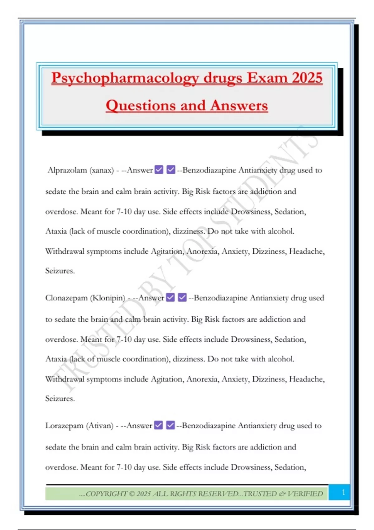 Psychopharmacology drugs Exam 2025