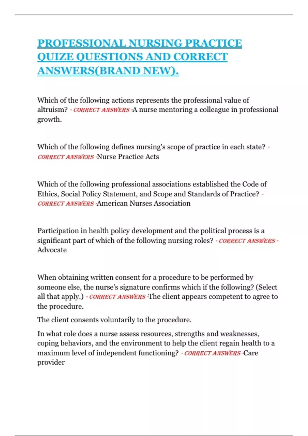 Which of the following actions represents the professional value of altruism? - CorreCt Answers -A nurse mentoring a colleague in professional growth. Which of the following defines nursing's scope of practice in each state? - CorreCt Answers -Nurse Practice Acts Which of the following professional associations established the Code of Ethics, Social Policy Statement, and Scope and Standards of Practice? - CorreCt Answers -American Nurses Association Participation in health policy development and the political process is a significant part of which of the following nursing roles? - CorreCt Answers - Advocate