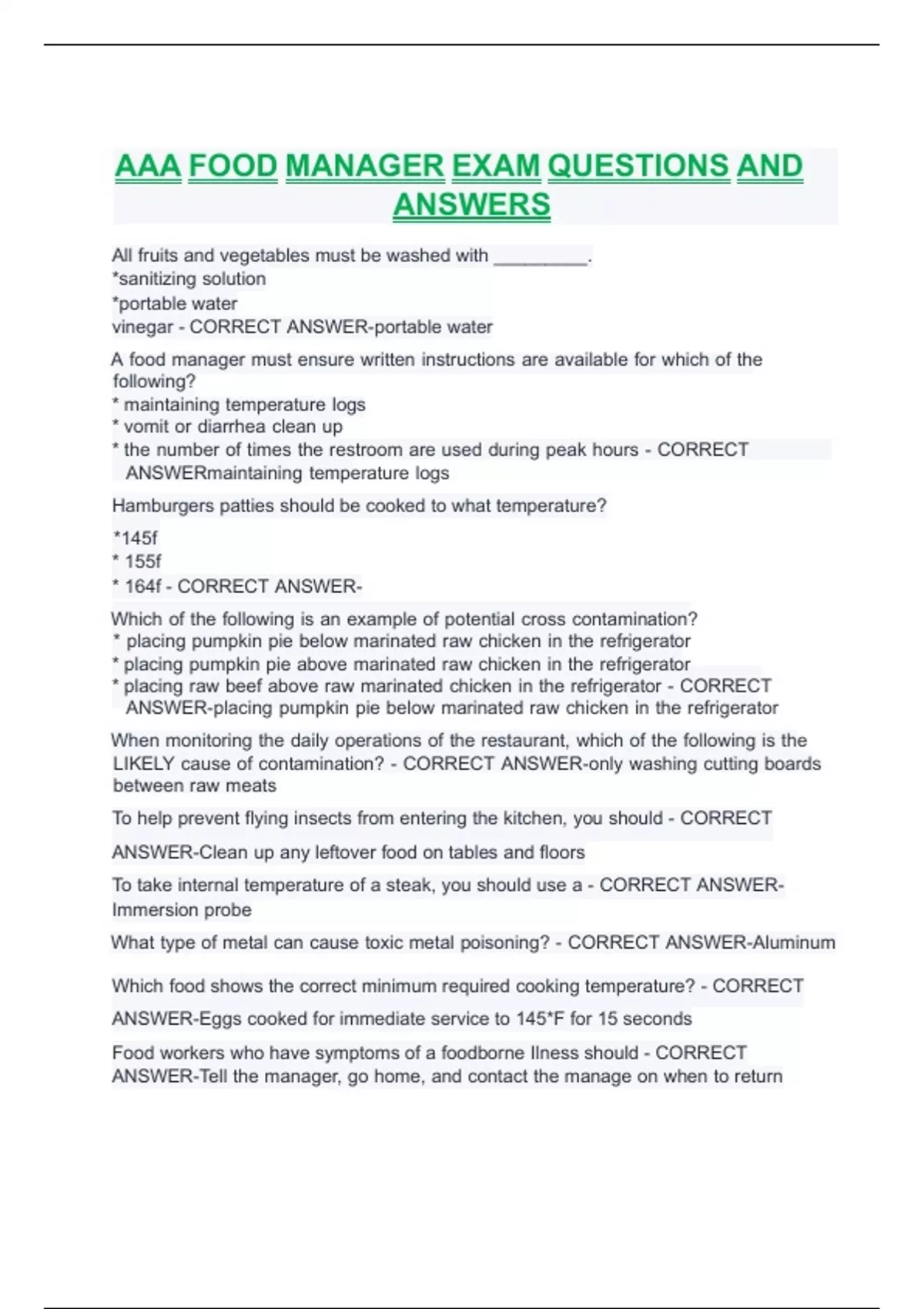 AAA FOOD MANAGER EXAM QUESTIONS AND