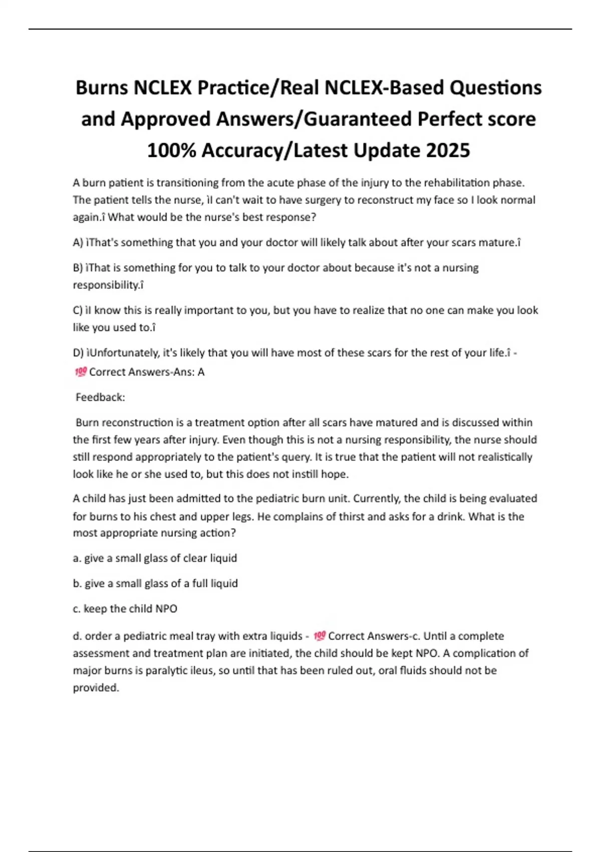 d. level of pain - Correct Answers-a. in early burn care, the client's greatest need has to do