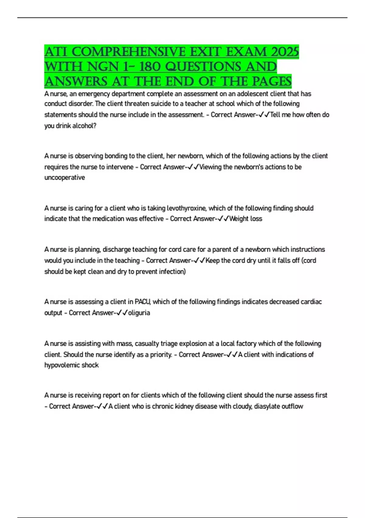 ATI COMPREHENSIVE EXIT EXAM 2025 WITH NGN 1- 180 QUESTIONS AND ANSWERS AT THE END OF THE PAGES A nurse, an emergency department complete an assessment on an adolescent client that has conduct disorder. The client threaten suicide to a teacher at school which of the following statements should the nurse include in the assessment. - Correct Answer-Tell me how often do you drink alcohol? A nurse is observing bonding to the client, her newborn, which of the following actions by the client requires the nurse to intervene - Correct Answer-Viewing the newborn's actions to be uncooperative A nurse is caring for a client who is taking levothyroxine, which of the following finding should indicate that the medication was effective - Correct Answer-Weight loss A nurse is planning, discharge teaching for cord care for a parent of a newborn which instructions would you include in the teaching - Correct Answer-Keep the cord dry until it falls off (cord should be kept clean and dry to prevent infection) A nurse is assessing a client in PACU, which of the following findings indicates decreased cardiac output - Correct Answer-oliguria A nurse is assisting with mass, casualty triage explosion at a local factory which of the following client. Should the nurse identify as a priority. - Correct Answer-A client with indications of hypovolemic shock A nurse is receiving report on for clients which of the following client should the nurse assess first - Correct Answer-A client who is chronic kidney disease with cloudy, diasylate outflow
