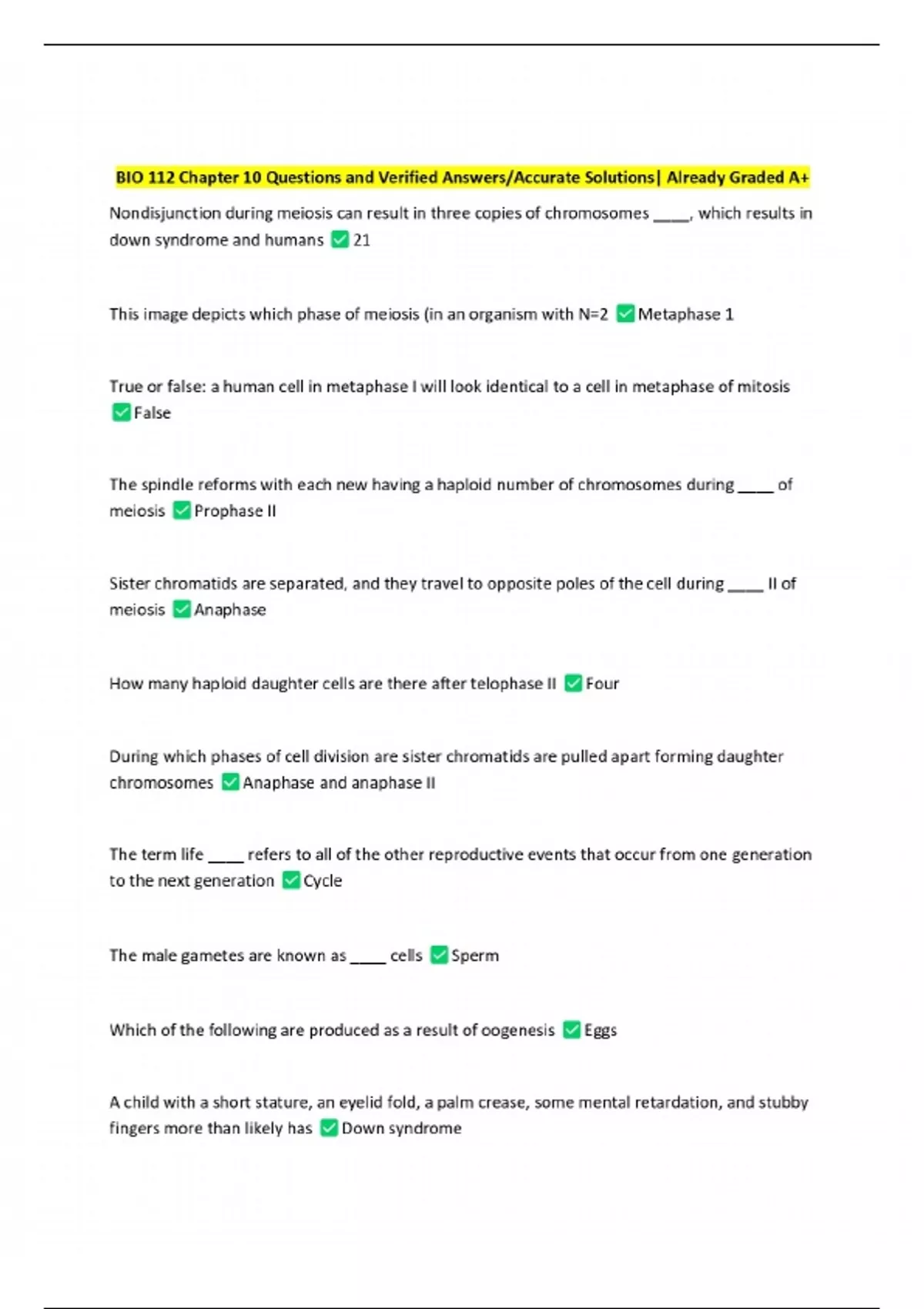 BIO 112 Chapter 10 Questions and Verified Answers/Accurate Solutions| Already Graded A+