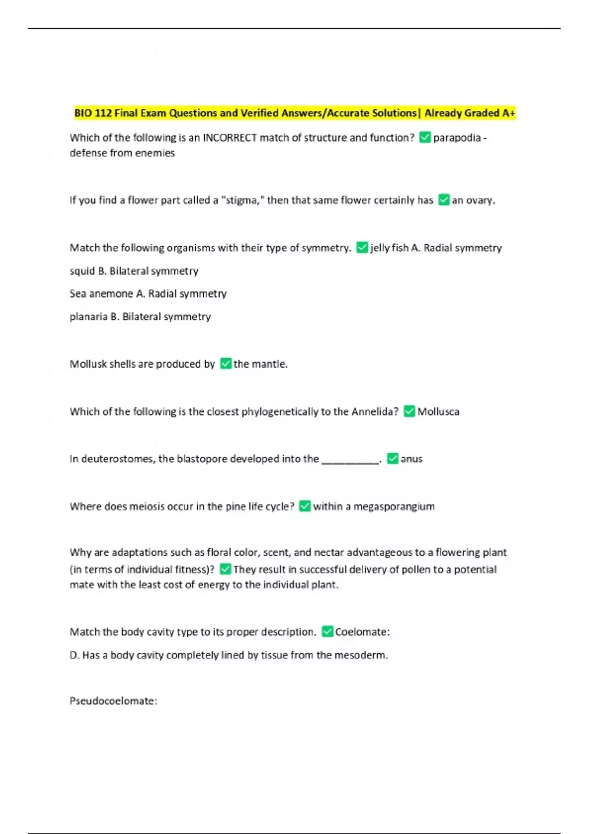 bio 112 final exam questions and verified answers