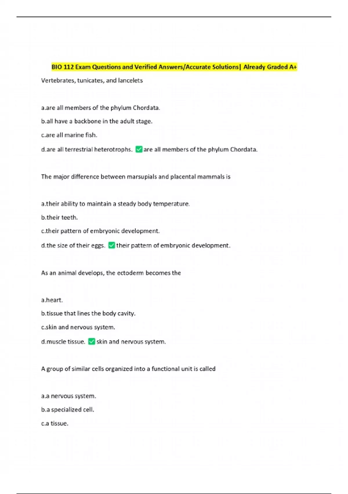 bio 112 exam questions and verified answersaccura