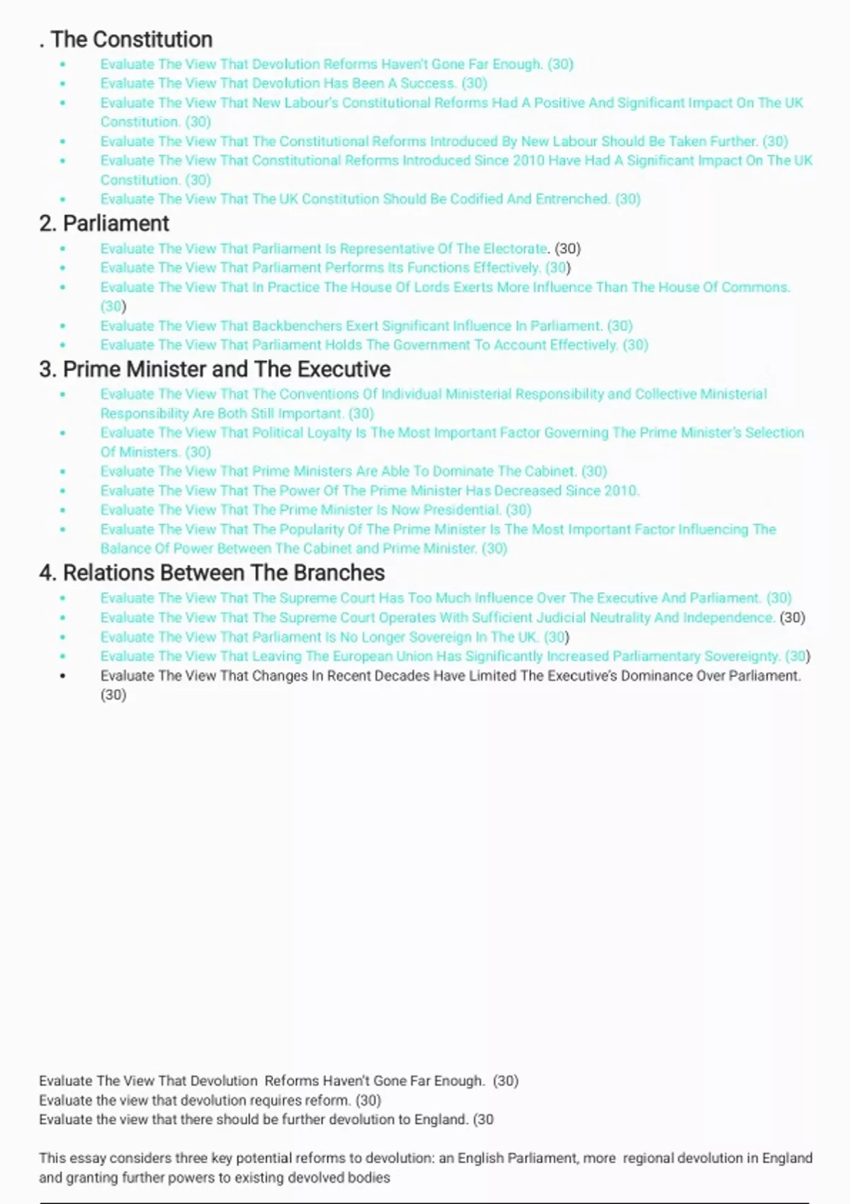 I've completed my exams in 2025, this contains the Essay plans I compiled over sixth-form directly correspondant to each area outlined by the specification. I used these to memorise all necessary information before my exams. I'm predicted 4 A* and an A for Politics and I am an offer holder for Cambridge. This contains : 22 Thourough essay plans + each 1 adaptable to an average 3 alternative questions = 66 Essay Plan variations Adaptations of politics explained Essay plans that I've shortened, re-organised at times fully optimised Recent and Up to Date Examples (06.25) Possible Alternatively phrased questions for each past paper question A PEACE structure Per each argument a subsequent direct counter argument